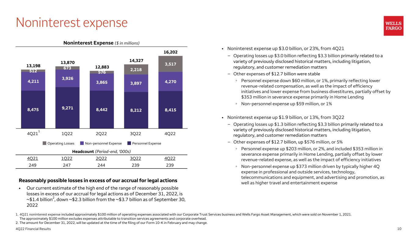 104Q22 Financial Results Noninterest expense • Noninterest expense up $3.0 billion, or 23%, from 4Q21 – Operating losses up $3.0 billion reflecting $3.3 billion primarily related to a variety of previously disclosed historical matters, including litigation, regulatory, and customer remediation matters – Other expenses of $12.7 billion were stable ◦ Personnel expense down $60 million, or 1%, primarily reflecting lower revenue-related compensation, as well as the impact of efficiency initiatives and lower expense from business divestitures, partially offset by $353 million in severance expense primarily in Home Lending ◦ Non-personnel expense up $59 million, or 1% • Noninterest expense up $1.9 billion, or 13%, from 3Q22 – Operating losses up $1.3 billion reflecting $3.3 billion primarily related to a variety of previously disclosed historical matters, including litigation, regulatory, and customer remediation matters – Other expenses of $12.7 billion, up $576 million, or 5% ◦ Personnel expense up $203 million, or 2%, and included $353 million in severance expense primarily in Home Lending, partially offset by lower revenue-related expense, as well as the impact of efficiency initiatives ◦ Non-personnel expense up $373 million driven by typically higher 4Q expense in professional and outside services, technology, telecommunications and equipment, and advertising and promotion, as well as higher travel and entertainment expense Noninterest Expense ($ in millions) 13,198 13,870 12,883 14,327 16,202 8,475 9,271 8,442 8,212 8,415 4,211 3,926 3,865 3,897 4,270 512 673 576 2,218 3,517 Operating Losses Non-personnel Expense Personnel Expense 4Q21 1Q22 2Q22 3Q22 4Q22 Headcount (Period-end, '000s) 4Q21 1Q22 2Q22 3Q22 4Q22 249 247 244 239 239 1. 4Q21 noninterest expense included approximately $100 million of operating expenses associated with our Corporate Trust Services business and Wells Fargo Asset Management, which were sold on November 1, 2021. The approximately $100 million excludes expenses attributable to transition services agreements and corporate overhead. 2. The amount for December 31, 2022, will be updated at the time of the filing of our Form 10-K in February and may change. 1 Reasonably possible losses in excess of our accrual for legal actions • Our current estimate of the high end of the range of reasonably possible losses in excess of our accrual for legal actions as of December 31, 2022, is ~$1.4 billion2, down ~$2.3 billion from the ~$3.7 billion as of September 30, 2022