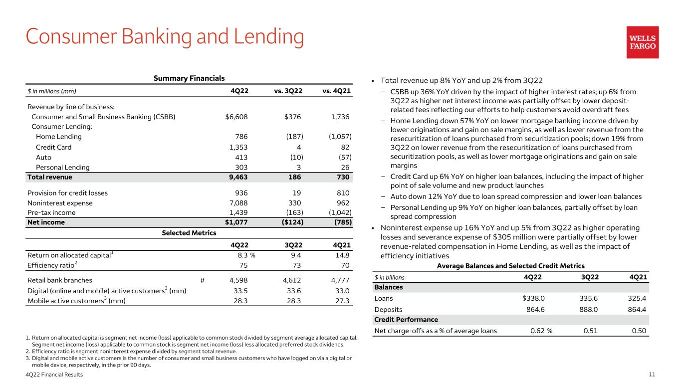 114Q22 Financial Results Consumer Banking and Lending • Total revenue up 8% YoY and up 2% from 3Q22 – CSBB up 36% YoY driven by the impact of higher interest rates; up 6% from 3Q22 as higher net interest income was partially offset by lower deposit- related fees reflecting our efforts to help customers avoid overdraft fees – Home Lending down 57% YoY on lower mortgage banking income driven by lower originations and gain on sale margins, as well as lower revenue from the resecuritization of loans purchased from securitization pools; down 19% from 3Q22 on lower revenue from the resecuritization of loans purchased from securitization pools, as well as lower mortgage originations and gain on sale margins – Credit Card up 6% YoY on higher loan balances, including the impact of higher point of sale volume and new product launches – Auto down 12% YoY due to loan spread compression and lower loan balances – Personal Lending up 9% YoY on higher loan balances, partially offset by loan spread compression • Noninterest expense up 16% YoY and up 5% from 3Q22 as higher operating losses and severance expense of $305 million were partially offset by lower revenue-related compensation in Home Lending, as well as the impact of efficiency initiatives 1. Return on allocated capital is segment net income (loss) applicable to common stock divided by segment average allocated capital. Segment net income (loss) applicable to common stock is segment net income (loss) less allocated preferred stock dividends. 2. Efficiency ratio is segment noninterest expense divided by segment total revenue. 3. Digital and mobile active customers is the number of consumer and small business customers who have logged on via a digital or mobile device, respectively, in the prior 90 days. Summary Financials $ in millions (mm) 4Q22 vs. 3Q22 vs. 4Q21 Revenue by line of business: Consumer and Small Business Banking (CSBB) $6,608 $376 1,736 Consumer Lending: Home Lending 786 (187) (1,057) Credit Card 1,353 4 82 Auto 413 (10) (57) Personal Lending 303 3 26 Total revenue 9,463 186 730 Provision for credit losses 936 19 810 Noninterest expense 7,088 330 962 Pre-tax income 1,439 (163) (1,042) Net income $1,077 ($124) (785) Selected Metrics 4Q22 3Q22 4Q21 Return on allocated capital1 8.3 % 9.4 14.8 Efficiency ratio2 75 73 70 Retail bank branches # 4,598 4,612 4,777 Digital (online and mobile) active customers3 (mm) 33.5 33.6 33.0 Mobile active customers3 (mm) 28.3 28.3 27.3 Average Balances and Selected Credit Metrics $ in billions 4Q22 3Q22 4Q21 Balances Loans $338.0 335.6 325.4 Deposits 864.6 888.0 864.4 Credit Performance Net charge-offs as a % of average loans 0.62 % 0.51 0.50