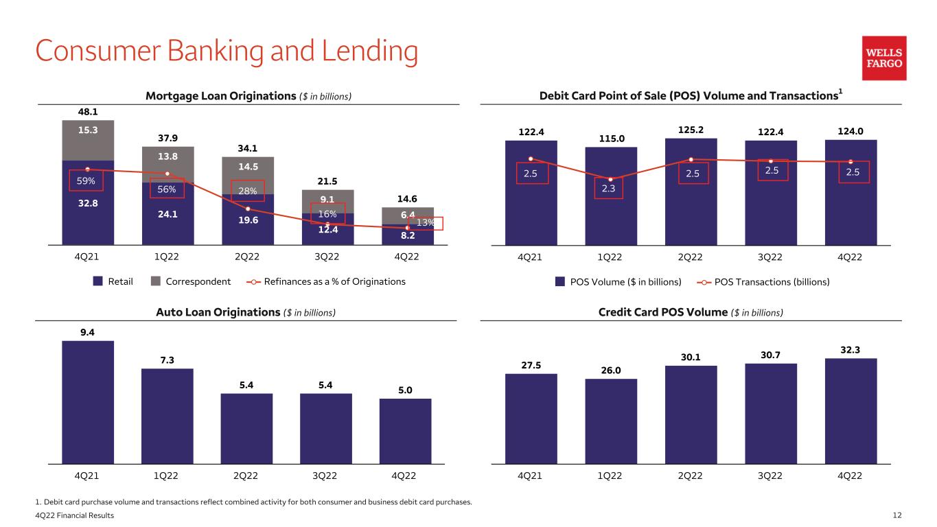 124Q22 Financial Results Consumer Banking and Lending Mortgage Loan Originations ($ in billions) Auto Loan Originations ($ in billions) Credit Card POS Volume ($ in billions) Debit Card Point of Sale (POS) Volume and Transactions1 1. Debit card purchase volume and transactions reflect combined activity for both consumer and business debit card purchases. 48.1 37.9 34.1 21.5 14.632.8 24.1 19.6 12.4 8.2 15.3 13.8 14.5 9.1 6.4 Retail Correspondent Refinances as a % of Originations 4Q21 1Q22 2Q22 3Q22 4Q22 122.4 115.0 125.2 122.4 124.0 POS Volume ($ in billions) POS Transactions (billions) 4Q21 1Q22 2Q22 3Q22 4Q22 9.4 7.3 5.4 5.4 5.0 4Q21 1Q22 2Q22 3Q22 4Q22 27.5 26.0 30.1 30.7 32.3 4Q21 1Q22 2Q22 3Q22 4Q22 2.5 2.3 2.5 2.5 2.5 59% 56% 28% 16% 13%