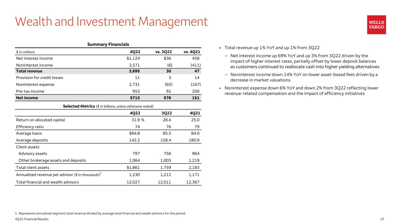 154Q22 Financial Results Wealth and Investment Management Summary Financials $ in millions 4Q22 vs. 3Q22 vs. 4Q21 Net interest income $1,124 $36 458 Noninterest income 2,571 (6) (411) Total revenue 3,695 30 47 Provision for credit losses 11 3 14 Noninterest expense 2,731 (65) (167) Pre-tax income 953 92 200 Net income $715 $76 151 Selected Metrics ($ in billions, unless otherwise noted) 4Q22 3Q22 4Q21 Return on allocated capital 31.9 % 28.4 25.0 Efficiency ratio 74 76 79 Average loans $84.8 85.5 84.0 Average deposits 142.2 158.4 180.9 Client assets Advisory assets 797 756 964 Other brokerage assets and deposits 1,064 1,003 1,219 Total client assets $1,861 1,759 2,183 Annualized revenue per advisor ($ in thousands)1 1,230 1,212 1,171 Total financial and wealth advisors 12,027 12,011 12,367 1. Represents annualized segment total revenue divided by average total financial and wealth advisors for the period. • Total revenue up 1% YoY and up 1% from 3Q22 – Net interest income up 69% YoY and up 3% from 3Q22 driven by the impact of higher interest rates, partially offset by lower deposit balances as customers continued to reallocate cash into higher yielding alternatives – Noninterest income down 14% YoY on lower asset-based fees driven by a decrease in market valuations • Noninterest expense down 6% YoY and down 2% from 3Q22 reflecting lower revenue-related compensation and the impact of efficiency initiatives