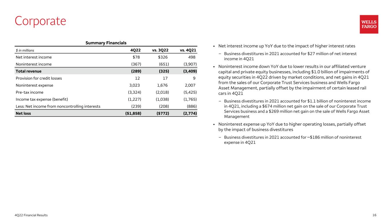 164Q22 Financial Results Corporate • Net interest income up YoY due to the impact of higher interest rates – Business divestitures in 2021 accounted for $27 million of net interest income in 4Q21 • Noninterest income down YoY due to lower results in our affiliated venture capital and private equity businesses, including $1.0 billion of impairments of equity securities in 4Q22 driven by market conditions, and net gains in 4Q21 from the sales of our Corporate Trust Services business and Wells Fargo Asset Management, partially offset by the impairment of certain leased rail cars in 4Q21 – Business divestitures in 2021 accounted for $1.1 billion of noninterest income in 4Q21, including a $674 million net gain on the sale of our Corporate Trust Services business and a $269 million net gain on the sale of Wells Fargo Asset Management • Noninterest expense up YoY due to higher operating losses, partially offset by the impact of business divestitures – Business divestitures in 2021 accounted for ~$186 million of noninterest expense in 4Q21 Summary Financials $ in millions 4Q22 vs. 3Q22 vs. 4Q21 Net interest income $78 $326 498 Noninterest income (367) (651) (3,907) Total revenue (289) (325) (3,409) Provision for credit losses 12 17 9 Noninterest expense 3,023 1,676 2,007 Pre-tax income (3,324) (2,018) (5,425) Income tax expense (benefit) (1,227) (1,038) (1,765) Less: Net income from noncontrolling interests (239) (208) (886) Net loss ($1,858) ($772) (2,774)