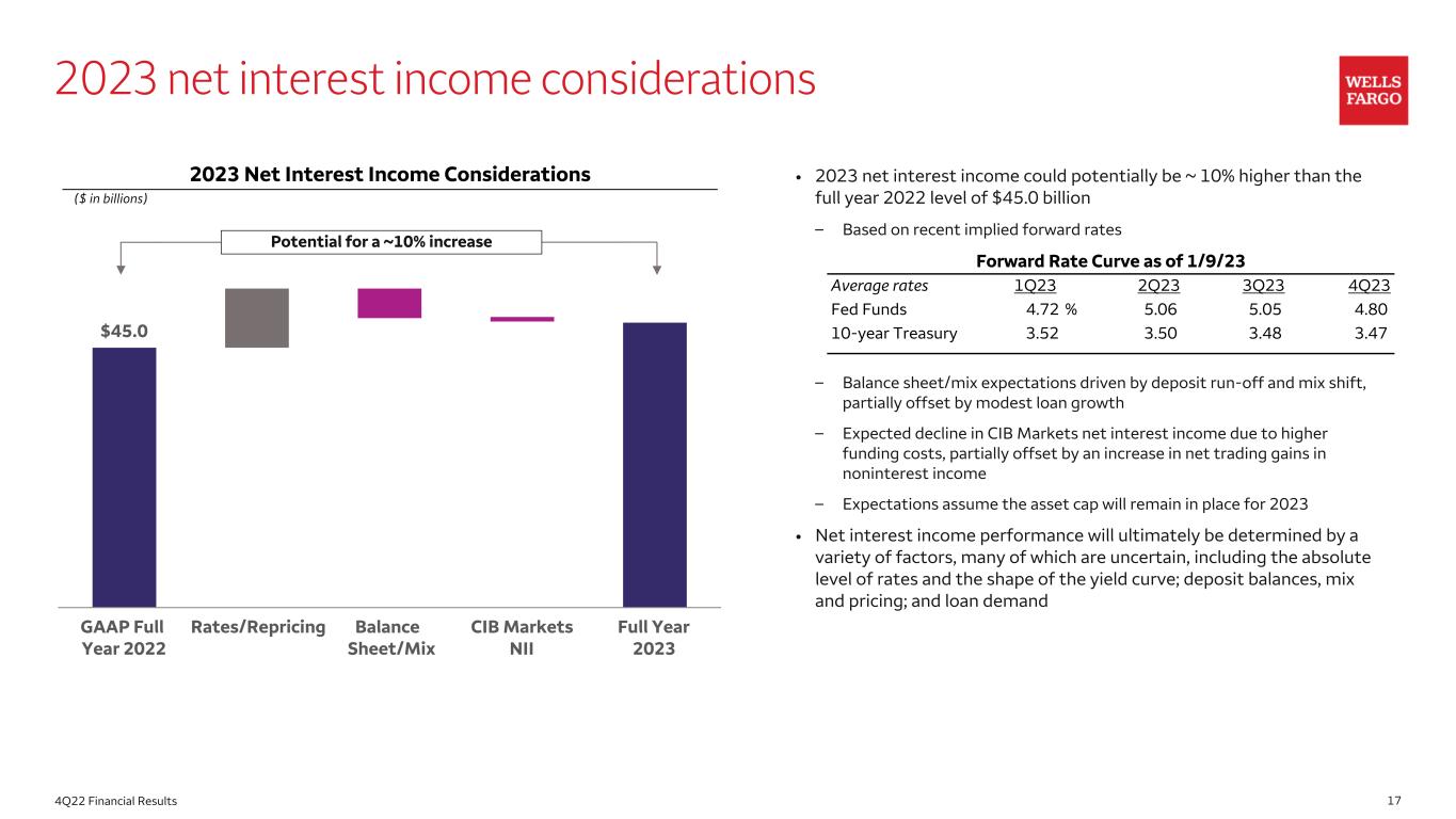 174Q22 Financial Results $45.0 GAAP Full Year 2022 Rates/Repricing Balance Sheet/Mix CIB Markets NII Full Year 2023 2023 net interest income considerations 2023 Net Interest Income Considerations • 2023 net interest income could potentially be ~ 10% higher than the full year 2022 level of $45.0 billion – Based on recent implied forward rates – Balance sheet/mix expectations driven by deposit run-off and mix shift, partially offset by modest loan growth – Expected decline in CIB Markets net interest income due to higher funding costs, partially offset by an increase in net trading gains in noninterest income – Expectations assume the asset cap will remain in place for 2023 • Net interest income performance will ultimately be determined by a variety of factors, many of which are uncertain, including the absolute level of rates and the shape of the yield curve; deposit balances, mix and pricing; and loan demand Potential for a ~10% increase ($ in billions) Forward Rate Curve as of 1/9/23 Average rates 1Q23 2Q23 3Q23 4Q23 Fed Funds 4.72 % 5.06 5.05 4.80 10-year Treasury 3.52 3.50 3.48 3.47