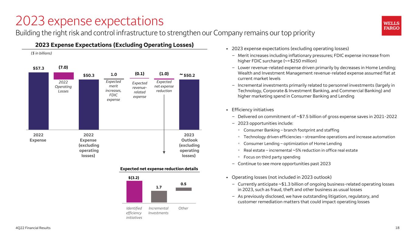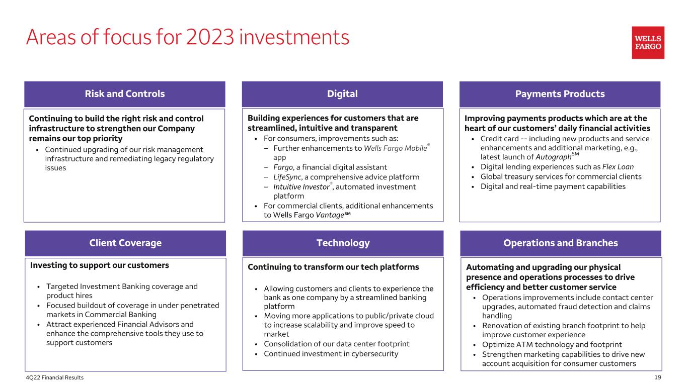 194Q22 Financial Results Investing to support our customers • Targeted Investment Banking coverage and product hires • Focused buildout of coverage in under penetrated markets in Commercial Banking • Attract experienced Financial Advisors and enhance the comprehensive tools they use to support customers Areas of focus for 2023 investments Improving payments products which are at the heart of our customers’ daily financial activities • Credit card -- including new products and service enhancements and additional marketing, e.g., latest launch of AutographSM • Digital lending experiences such as Flex Loan • Global treasury services for commercial clients • Digital and real-time payment capabilities Payments ProductsRisk and Controls Digital Operations and BranchesClient Coverage Technology Continuing to transform our tech platforms • Allowing customers and clients to experience the bank as one company by a streamlined banking platform • Moving more applications to public/private cloud to increase scalability and improve speed to market • Consolidation of our data center footprint • Continued investment in cybersecurity Continuing to build the right risk and control infrastructure to strengthen our Company remains our top priority • Continued upgrading of our risk management infrastructure and remediating legacy regulatory issues Building experiences for customers that are streamlined, intuitive and transparent • For consumers, improvements such as: – Further enhancements to Wells Fargo Mobile® app – Fargo, a financial digital assistant – LifeSync, a comprehensive advice platform – Intuitive Investor®, automated investment platform • For commercial clients, additional enhancements to Wells Fargo Vantage℠ Automating and upgrading our physical presence and operations processes to drive efficiency and better customer service • Operations improvements include contact center upgrades, automated fraud detection and claims handling • Renovation of existing branch footprint to help improve customer experience • Optimize ATM technology and footprint • Strengthen marketing capabilities to drive new account acquisition for consumer customers