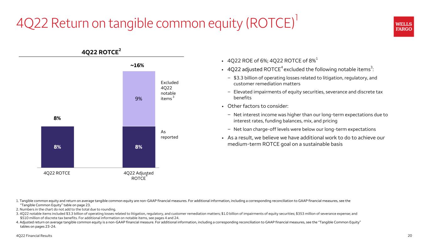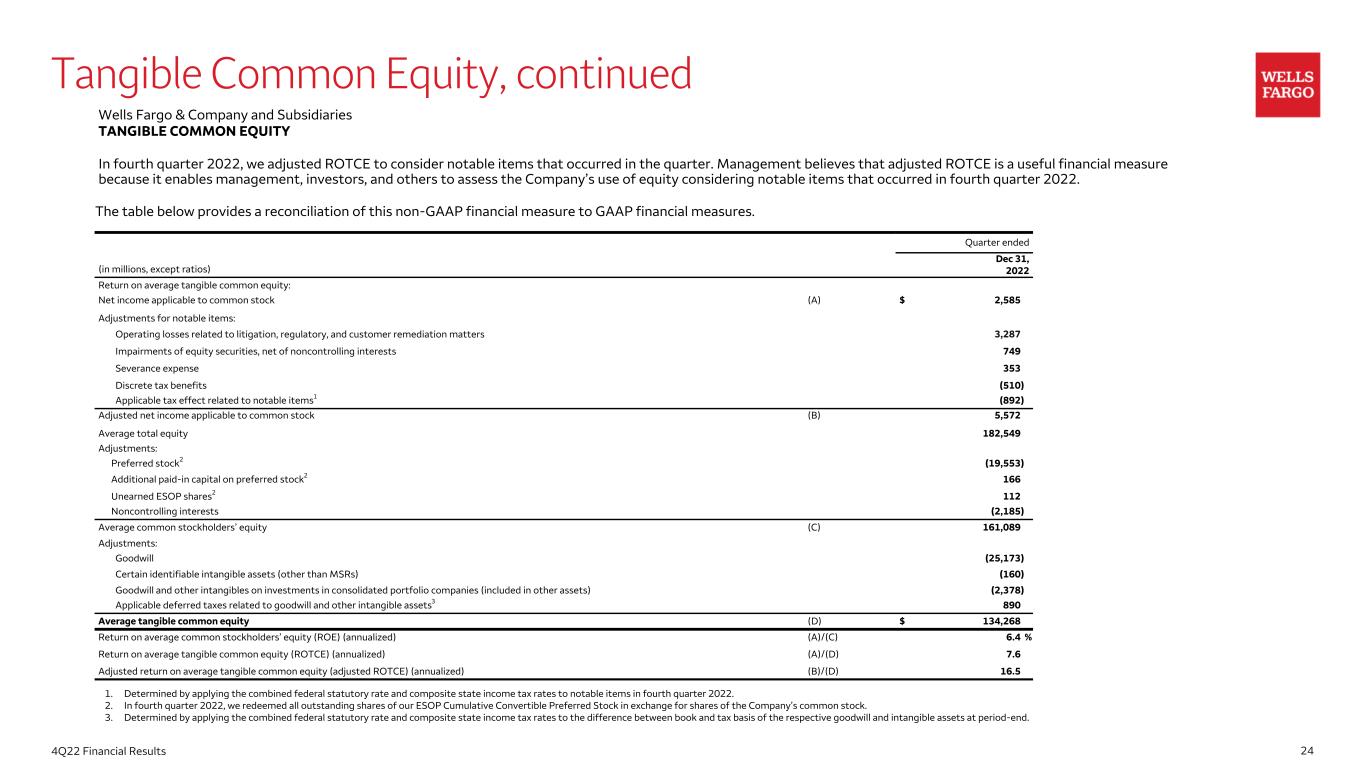 244Q22 Financial Results Tangible Common Equity, continued Wells Fargo & Company and Subsidiaries TANGIBLE COMMON EQUITY In fourth quarter 2022, we adjusted ROTCE to consider notable items that occurred in the quarter. Management believes that adjusted ROTCE is a useful financial measure because it enables management, investors, and others to assess the Company’s use of equity considering notable items that occurred in fourth quarter 2022. The table below provides a reconciliation of this non-GAAP financial measure to GAAP financial measures. Quarter ended (in millions, except ratios) Dec 31, 2022 Return on average tangible common equity: Net income applicable to common stock (A) $ 2,585 Adjustments for notable items: Operating losses related to litigation, regulatory, and customer remediation matters 3,287 Impairments of equity securities, net of noncontrolling interests 749 Severance expense 353 Discrete tax benefits (510) Applicable tax effect related to notable items1 (892) Adjusted net income applicable to common stock (B) 5,572 Average total equity 182,549 Adjustments: Preferred stock2 (19,553) Additional paid-in capital on preferred stock2 166 Unearned ESOP shares2 112 Noncontrolling interests (2,185) Average common stockholders’ equity (C) 161,089 Adjustments: Goodwill (25,173) Certain identifiable intangible assets (other than MSRs) (160) Goodwill and other intangibles on investments in consolidated portfolio companies (included in other assets) (2,378) Applicable deferred taxes related to goodwill and other intangible assets3 890 Average tangible common equity (D) $ 134,268 Return on average common stockholders’ equity (ROE) (annualized) (A)/(C) 6.4 % Return on average tangible common equity (ROTCE) (annualized) (A)/(D) 7.6 Adjusted return on average tangible common equity (adjusted ROTCE) (annualized) (B)/(D) 16.5 1. Determined by applying the combined federal statutory rate and composite state income tax rates to notable items in fourth quarter 2022. 2. In fourth quarter 2022, we redeemed all outstanding shares of our ESOP Cumulative Convertible Preferred Stock in exchange for shares of the Company’s common stock. 3. Determined by applying the combined federal statutory rate and composite state income tax rates to the difference between book and tax basis of the respective goodwill and intangible assets at period-end.