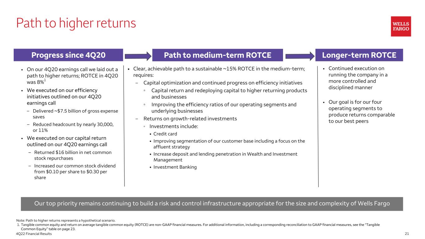 214Q22 Financial Results ~ • Clear, achievable path to a sustainable ~15% ROTCE in the medium-term; requires: – Capital optimization and continued progress on efficiency initiatives ◦ Capital return and redeploying capital to higher returning products and businesses ◦ Improving the efficiency ratios of our operating segments and underlying businesses – Returns on growth-related investments ◦ Investments include: • Credit card • Improving segmentation of our customer base including a focus on the affluent strategy • Increase deposit and lending penetration in Wealth and Investment Management • Investment Banking • On our 4Q20 earnings call we laid out a path to higher returns; ROTCE in 4Q20 was 8%1 • We executed on our efficiency initiatives outlined on our 4Q20 earnings call – Delivered ~$7.5 billion of gross expense saves – Reduced headcount by nearly 30,000, or 11% • We executed on our capital return outlined on our 4Q20 earnings call – Returned $16 billion in net common stock repurchases – Increased our common stock dividend from $0.10 per share to $0.30 per share Progress since 4Q20 Path to medium-term ROTCE Longer-term ROTCE Our top priority remains continuing to build a risk and control infrastructure appropriate for the size and complexity of Wells Fargo • Continued execution on running the company in a more controlled and disciplined manner • Our goal is for our four operating segments to produce returns comparable to our best peers Note: Path to higher returns represents a hypothetical scenario. 1. Tangible common equity and return on average tangible common equity (ROTCE) are non-GAAP financial measures. For additional information, including a corresponding reconciliation to GAAP financial measures, see the “Tangible Common Equity” table on page 23. Path to higher returns