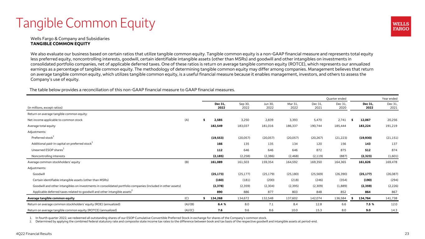 234Q22 Financial Results Tangible Common Equity Wells Fargo & Company and Subsidiaries TANGIBLE COMMON EQUITY We also evaluate our business based on certain ratios that utilize tangible common equity. Tangible common equity is a non-GAAP financial measure and represents total equity less preferred equity, noncontrolling interests, goodwill, certain identifiable intangible assets (other than MSRs) and goodwill and other intangibles on investments in consolidated portfolio companies, net of applicable deferred taxes. One of these ratios is return on average tangible common equity (ROTCE), which represents our annualized earnings as a percentage of tangible common equity. The methodology of determining tangible common equity may differ among companies. Management believes that return on average tangible common equity, which utilizes tangible common equity, is a useful financial measure because it enables management, investors, and others to assess the Company’s use of equity. The table below provides a reconciliation of this non-GAAP financial measure to GAAP financial measures. Quarter ended Year ended (in millions, except ratios) Dec 31, 2022 Sep 30, 2022 Jun 30, 2022 Mar 31, 2022 Dec 31, 2021 Dec 31, 2020 Dec 31, 2022 Dec 31, 2021 Return on average tangible common equity: Net income applicable to common stock (A) $ 2,585 3,250 2,839 3,393 5,470 2,741 $ 12,067 20,256 Average total equity 182,549 183,037 181,016 186,337 190,744 185,444 183,224 191,219 Adjustments: Preferred stock1 (19,553) (20,057) (20,057) (20,057) (20,267) (21,223) (19,930) (21,151) Additional paid-in capital on preferred stock1 166 135 135 134 120 156 143 137 Unearned ESOP shares1 112 646 646 646 872 875 512 874 Noncontrolling interests (2,185) (2,258) (2,386) (2,468) (2,119) (887) (2,323) (1,601) Average common stockholders’ equity (B) 161,089 161,503 159,354 164,592 169,350 164,365 161,626 169,478 Adjustments: Goodwill (25,173) (25,177) (25,179) (25,180) (25,569) (26,390) (25,177) (26,087) Certain identifiable intangible assets (other than MSRs) (160) (181) (200) (218) (246) (354) (190) (294) Goodwill and other intangibles on investments in consolidated portfolio companies (included in other assets) (2,378) (2,359) (2,304) (2,395) (2,309) (1,889) (2,359) (2,226) Applicable deferred taxes related to goodwill and other intangible assets2 890 886 877 803 848 852 864 867 Average tangible common equity (C) $ 134,268 134,672 132,548 137,602 142,074 136,584 $ 134,764 141,738 Return on average common stockholders’ equity (ROE) (annualized) (A)/(B) 6.4 % 8.0 7.1 8.4 12.8 6.6 7.5 % 12.0 Return on average tangible common equity (ROTCE) (annualized) (A)/(C) 7.6 9.6 8.6 10.0 15.3 8.0 9.0 14.3 1. In fourth quarter 2022, we redeemed all outstanding shares of our ESOP Cumulative Convertible Preferred Stock in exchange for shares of the Company’s common stock. 2. Determined by applying the combined federal statutory rate and composite state income tax rates to the difference between book and tax basis of the respective goodwill and intangible assets at period-end.