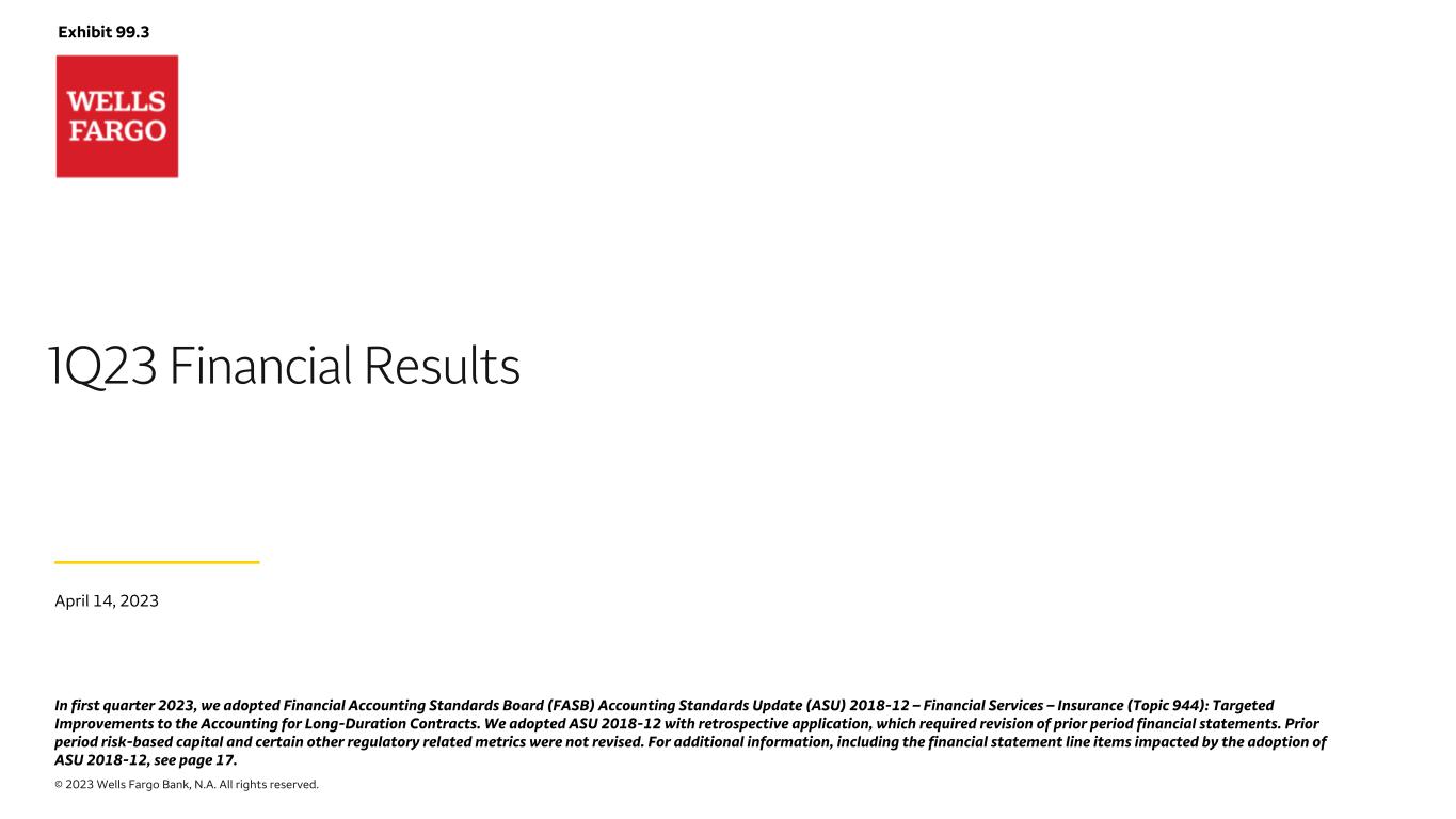 © 2023 Wells Fargo Bank, N.A. All rights reserved. 1Q23 Financial Results April 14, 2023 Exhibit 99.3 In first quarter 2023, we adopted Financial Accounting Standards Board (FASB) Accounting Standards Update (ASU) 2018-12 – Financial Services – Insurance (Topic 944): Targeted Improvements to the Accounting for Long-Duration Contracts. We adopted ASU 2018-12 with retrospective application, which required revision of prior period financial statements. Prior period risk-based capital and certain other regulatory related metrics were not revised. For additional information, including the financial statement line items impacted by the adoption of ASU 2018-12, see page 17.