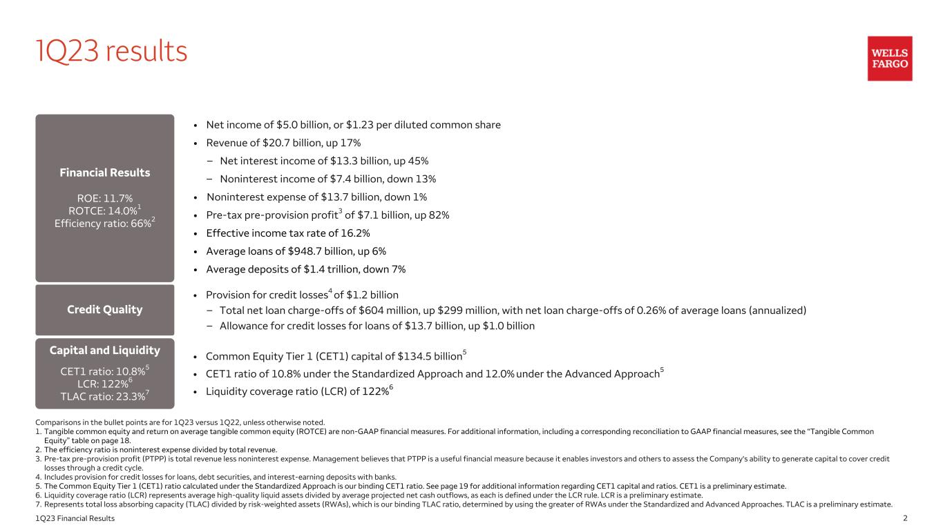 21Q23 Financial Results 1Q23 results Financial Results ROE: 11.7% ROTCE: 14.0%1 Efficiency ratio: 66%2 Credit Quality Capital and Liquidity CET1 ratio: 10.8%5 LCR: 122%6 TLAC ratio: 23.3%7 • Provision for credit losses4 of $1.2 billion – Total net loan charge-offs of $604 million, up $299 million, with net loan charge-offs of 0.26% of average loans (annualized) – Allowance for credit losses for loans of $13.7 billion, up $1.0 billion • Common Equity Tier 1 (CET1) capital of $134.5 billion5 • CET1 ratio of 10.8% under the Standardized Approach and 12.0% under the Advanced Approach5 • Liquidity coverage ratio (LCR) of 122%6 Comparisons in the bullet points are for 1Q23 versus 1Q22, unless otherwise noted. 1. Tangible common equity and return on average tangible common equity (ROTCE) are non-GAAP financial measures. For additional information, including a corresponding reconciliation to GAAP financial measures, see the “Tangible Common Equity” table on page 18. 2. The efficiency ratio is noninterest expense divided by total revenue. 3. Pre-tax pre-provision profit (PTPP) is total revenue less noninterest expense. Management believes that PTPP is a useful financial measure because it enables investors and others to assess the Company's ability to generate capital to cover credit losses through a credit cycle. 4. Includes provision for credit losses for loans, debt securities, and interest-earning deposits with banks. 5. The Common Equity Tier 1 (CET1) ratio calculated under the Standardized Approach is our binding CET1 ratio. See page 19 for additional information regarding CET1 capital and ratios. CET1 is a preliminary estimate. 6. Liquidity coverage ratio (LCR) represents average high-quality liquid assets divided by average projected net cash outflows, as each is defined under the LCR rule. LCR is a preliminary estimate. 7. Represents total loss absorbing capacity (TLAC) divided by risk-weighted assets (RWAs), which is our binding TLAC ratio, determined by using the greater of RWAs under the Standardized and Advanced Approaches. TLAC is a preliminary estimate. • Net income of $5.0 billion, or $1.23 per diluted common share • Revenue of $20.7 billion, up 17% – Net interest income of $13.3 billion, up 45% – Noninterest income of $7.4 billion, down 13% • Noninterest expense of $13.7 billion, down 1% • Pre-tax pre-provision profit3 of $7.1 billion, up 82% • Effective income tax rate of 16.2% • Average loans of $948.7 billion, up 6% • Average deposits of $1.4 trillion, down 7%