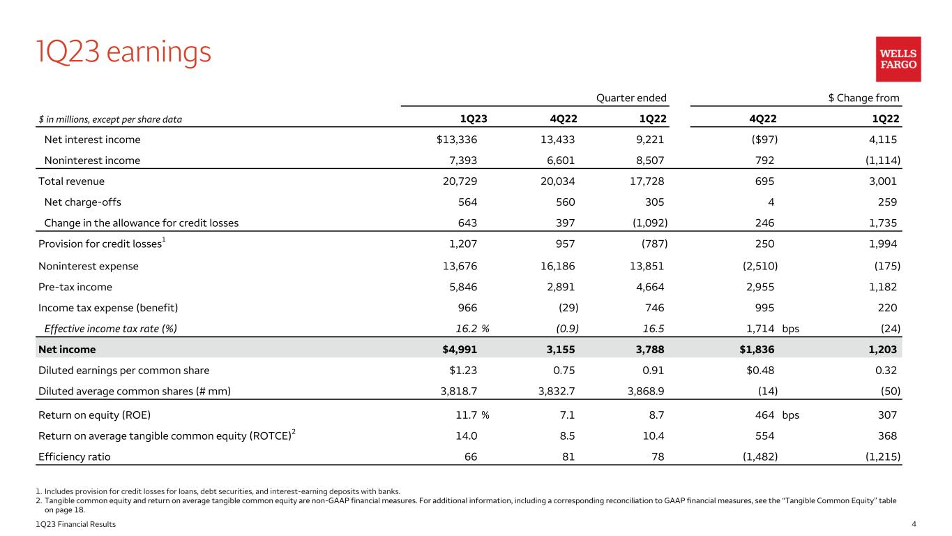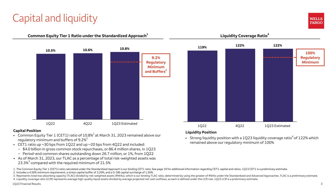201Q23 Financial Results Disclaimer and forward-looking statements Financial results reported in this document are preliminary. Final financial results and other disclosures will be reported in our Quarterly Report on Form 10-Q for the quarter ended March 31, 2023, and may differ materially from the results and disclosures in this document due to, among other things, the completion of final review procedures, the occurrence of subsequent events, or the discovery of additional information. This document contains forward-looking statements. In addition, we may make forward-looking statements in our other documents filed or furnished with the Securities and Exchange Commission, and our management may make forward-looking statements orally to analysts, investors, representatives of the media and others. Forward-looking statements can be identified by words such as “anticipates,” “intends,” “plans,” “seeks,” “believes,” “estimates,” “expects,” “target,” “projects,” “outlook,” “forecast,” “will,” “may,” “could,” “should,” “can” and similar references to future periods. In particular, forward-looking statements include, but are not limited to, statements we make about: (i) the future operating or financial performance of the Company, including our outlook for future growth; (ii) our noninterest expense and efficiency ratio; (iii) future credit quality and performance, including our expectations regarding future loan losses, our allowance for credit losses, and the economic scenarios considered to develop the allowance; (iv) our expectations regarding net interest income and net interest margin; (v) loan growth or the reduction or mitigation of risk in our loan portfolios; (vi) future capital or liquidity levels, ratios or targets; (vii) the performance of our mortgage business and any related exposures; (viii) the expected outcome and impact of legal, regulatory and legislative developments, as well as our expectations regarding compliance therewith; (ix) future common stock dividends, common share repurchases and other uses of capital; (x) our targeted range for return on assets, return on equity, and return on tangible common equity; (xi) expectations regarding our effective income tax rate; (xii) the outcome of contingencies, such as legal proceedings; (xiii) environmental, social and governance related goals or commitments; and (xiv) the Company’s plans, objectives and strategies. Forward-looking statements are not based on historical facts but instead represent our current expectations and assumptions regarding our business, the economy and other future conditions. Investors are urged to not unduly rely on forward-looking statements as actual results could differ materially from expectations. Forward- looking statements speak only as of the date made, and we do not undertake to update them to reflect changes or events that occur after that date. For more information about factors that could cause actual results to differ materially from expectations, refer to the “Forward-Looking Statements” discussion in Wells Fargo’s press release announcing our first quarter 2023 results and in our most recent Quarterly Report on Form 10-Q, as well as to Wells Fargo’s other reports filed with the Securities and Exchange Commission, including the discussion under “Risk Factors” in our Annual Report on Form 10-K for the year ended December 31, 2022.