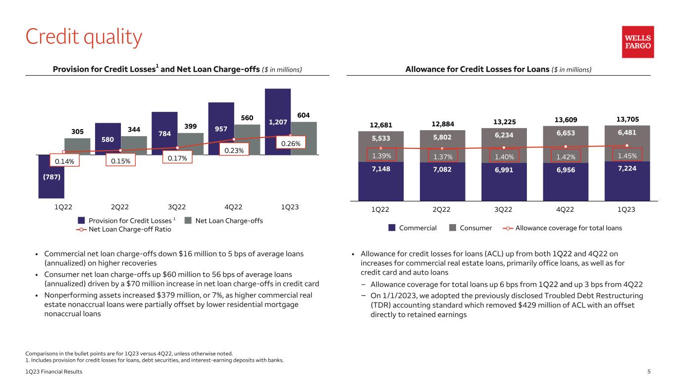 51Q23 Financial Results Credit quality • Commercial net loan charge-offs down $16 million to 5 bps of average loans (annualized) on higher recoveries • Consumer net loan charge-offs up $60 million to 56 bps of average loans (annualized) driven by a $70 million increase in net loan charge-offs in credit card • Nonperforming assets increased $379 million, or 7%, as higher commercial real estate nonaccrual loans were partially offset by lower residential mortgage nonaccrual loans Provision for Credit Losses1 and Net Loan Charge-offs ($ in millions) Allowance for Credit Losses for Loans ($ in millions) • Allowance for credit losses for loans (ACL) up from both 1Q22 and 4Q22 on increases for commercial real estate loans, primarily office loans, as well as for credit card and auto loans – Allowance coverage for total loans up 6 bps from 1Q22 and up 3 bps from 4Q22 – On 1/1/2023, we adopted the previously disclosed Troubled Debt Restructuring (TDR) accounting standard which removed $429 million of ACL with an offset directly to retained earnings Comparisons in the bullet points are for 1Q23 versus 4Q22, unless otherwise noted. 1. Includes provision for credit losses for loans, debt securities, and interest-earning deposits with banks. (787) 580 784 957 1,207 305 344 399 560 604 Provision for Credit Losses Net Loan Charge-offs Net Loan Charge-off Ratio 1Q22 2Q22 3Q22 4Q22 1Q23 12,681 12,884 13,225 13,609 13,705 7,148 7,082 6,991 6,956 7,224 5,533 5,802 6,234 6,653 6,481 Commercial Consumer Allowance coverage for total loans 1Q22 2Q22 3Q22 4Q22 1Q23 0.14% 0.15% 0.23% 0.17% 0.26% 1.37%1.39% 1.40% 1.42% 1.45% 1