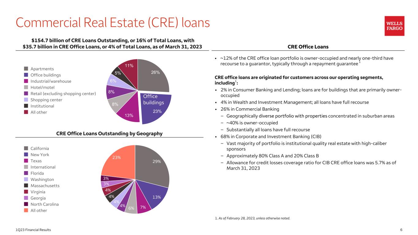 61Q23 Financial Results 26% 23% 13% 8% 8% 6% 5% 11% Apartments Office buildings Industrial/warehouse Hotel/motel Retail (excluding shopping center) Shopping center Institutional All other Commercial Real Estate (CRE) loans $154.7 billion of CRE Loans Outstanding, or 16% of Total Loans, with $35.7 billion in CRE Office Loans, or 4% of Total Loans, as of March 31, 2023 CRE Office Loans • ~12% of the CRE office loan portfolio is owner-occupied and nearly one-third have recourse to a guarantor, typically through a repayment guarantee 1 CRE office loans are originated for customers across our operating segments, including1: • 2% in Consumer Banking and Lending; loans are for buildings that are primarily owner- occupied • 4% in Wealth and Investment Management; all loans have full recourse • 26% in Commercial Banking – Geographically diverse portfolio with properties concentrated in suburban areas – ~40% is owner-occupied – Substantially all loans have full recourse • 68% in Corporate and Investment Banking (CIB) – Vast majority of portfolio is institutional quality real estate with high-caliber sponsors – Approximately 80% Class A and 20% Class B – Allowance for credit losses coverage ratio for CIB CRE office loans was 5.7% as of March 31, 2023 Office 1. As of February 28, 2023, unless otherwise noted. CRE Office Loans Outstanding by Geography 29% 13% 7%6%4% 4% 4% 4% 3% 3% 23% California New York Texas International Florida Washington Massachusetts Virginia Georgia North Carolina All other Office buildings