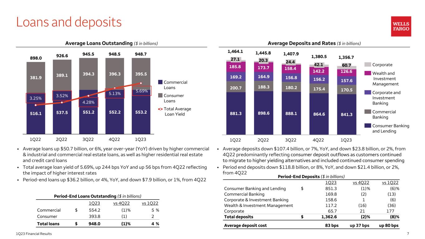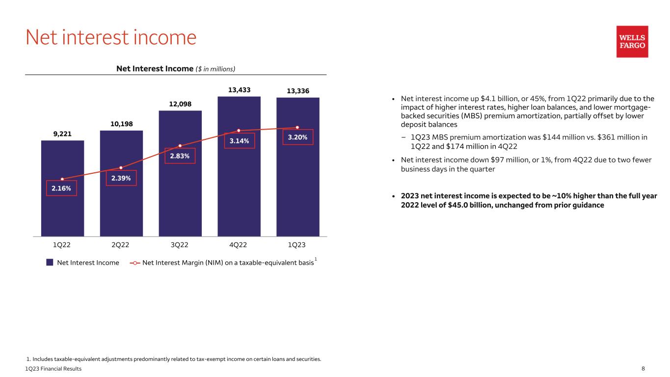 71Q23 Financial Results Loans and deposits • Average loans up $50.7 billion, or 6%, year over-year (YoY) driven by higher commercial & industrial and commercial real estate loans, as well as higher residential real estate and credit card loans • Total average loan yield of 5.69%, up 244 bps YoY and up 56 bps from 4Q22 reflecting the impact of higher interest rates • Period-end loans up $36.2 billion, or 4%, YoY, and down $7.9 billion, or 1%, from 4Q22 • Average deposits down $107.4 billion, or 7%, YoY, and down $23.8 billion, or 2%, from 4Q22 predominantly reflecting consumer deposit outflows as customers continued to migrate to higher yielding alternatives and included continued consumer spending • Period end deposits down $118.8 billion, or 8%, YoY, and down $21.4 billion, or 2%, from 4Q22 Average Loans Outstanding ($ in billions) Average Deposits and Rates ($ in billions) 898.0 926.6 945.5 948.5 948.7 516.1 537.5 551.2 552.2 553.2 381.9 389.1 394.3 396.3 395.5 Commercial Loans Consumer Loans Total Average Loan Yield 1Q22 2Q22 3Q22 4Q22 1Q23 3.25% 3.52% 4.28% 5.13% 5.69% Period-End Loans Outstanding ($ in billions) 1Q23 vs 4Q22 vs 1Q22 Commercial $ 554.2 (1) % 5 % Consumer 393.8 (1) 2 Total loans $ 948.0 (1) % 4 % Period-End Deposits ($ in billions) 1Q23 vs 4Q22 vs 1Q22 Consumer Banking and Lending $ 851.3 (1) % (6) % Commercial Banking 169.8 (2) (13) Corporate & Investment Banking 158.6 1 (6) Wealth & Investment Management 117.2 (16) (36) Corporate 65.7 21 177 Total deposits $ 1,362.6 (2) % (8) % Average deposit cost 83 bps up 37 bps up 80 bps 881.3 898.6 888.1 864.6 841.3 200.7 188.3 180.2 175.4 170.5 169.2 164.9 156.8 156.2 157.6 Corporate Wealth and Investment Management Corporate and Investment Banking Commercial Banking Consumer Banking and Lending 1Q22 2Q22 3Q22 4Q22 1Q23 1,445.81,464.1 1,407.9 1,380.5 1,356.727.1 20.3 24.4 42.1 60.7185.8 173.7 158.4 142.2 126.6