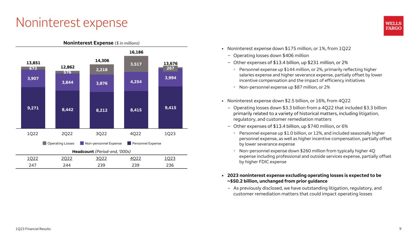 81Q23 Financial Results 9,221 10,198 12,098 13,433 13,336 Net Interest Income Net Interest Margin (NIM) on a taxable-equivalent basis 1Q22 2Q22 3Q22 4Q22 1Q23 3.20% Net interest income • Net interest income up $4.1 billion, or 45%, from 1Q22 primarily due to the impact of higher interest rates, higher loan balances, and lower mortgage- backed securities (MBS) premium amortization, partially offset by lower deposit balances – 1Q23 MBS premium amortization was $144 million vs. $361 million in 1Q22 and $174 million in 4Q22 • Net interest income down $97 million, or 1%, from 4Q22 due to two fewer business days in the quarter • 2023 net interest income is expected to be ~10% higher than the full year 2022 level of $45.0 billion, unchanged from prior guidance Net Interest Income ($ in millions) 2.16% 2.39% 2.83% 3.14% 1. Includes taxable-equivalent adjustments predominantly related to tax-exempt income on certain loans and securities. 1