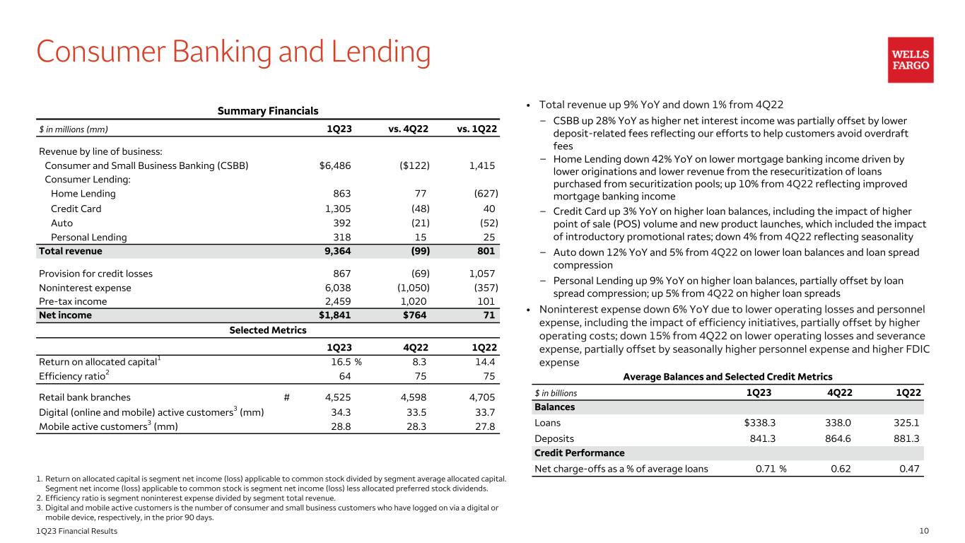 101Q23 Financial Results Consumer Banking and Lending • Total revenue up 9% YoY and down 1% from 4Q22 – CSBB up 28% YoY as higher net interest income was partially offset by lower deposit-related fees reflecting our efforts to help customers avoid overdraft fees – Home Lending down 42% YoY on lower mortgage banking income driven by lower originations and lower revenue from the resecuritization of loans purchased from securitization pools; up 10% from 4Q22 reflecting improved mortgage banking income – Credit Card up 3% YoY on higher loan balances, including the impact of higher point of sale (POS) volume and new product launches, which included the impact of introductory promotional rates; down 4% from 4Q22 reflecting seasonality – Auto down 12% YoY and 5% from 4Q22 on lower loan balances and loan spread compression – Personal Lending up 9% YoY on higher loan balances, partially offset by loan spread compression; up 5% from 4Q22 on higher loan spreads • Noninterest expense down 6% YoY due to lower operating losses and personnel expense, including the impact of efficiency initiatives, partially offset by higher operating costs; down 15% from 4Q22 on lower operating losses and severance expense, partially offset by seasonally higher personnel expense and higher FDIC expense 1. Return on allocated capital is segment net income (loss) applicable to common stock divided by segment average allocated capital. Segment net income (loss) applicable to common stock is segment net income (loss) less allocated preferred stock dividends. 2. Efficiency ratio is segment noninterest expense divided by segment total revenue. 3. Digital and mobile active customers is the number of consumer and small business customers who have logged on via a digital or mobile device, respectively, in the prior 90 days. Summary Financials $ in millions (mm) 1Q23 vs. 4Q22 vs. 1Q22 Revenue by line of business: Consumer and Small Business Banking (CSBB) $6,486 ($122) 1,415 Consumer Lending: Home Lending 863 77 (627) Credit Card 1,305 (48) 40 Auto 392 (21) (52) Personal Lending 318 15 25 Total revenue 9,364 (99) 801 Provision for credit losses 867 (69) 1,057 Noninterest expense 6,038 (1,050) (357) Pre-tax income 2,459 1,020 101 Net income $1,841 $764 71 Selected Metrics 1Q23 4Q22 1Q22 Return on allocated capital1 16.5 % 8.3 14.4 Efficiency ratio2 64 75 75 Retail bank branches # 4,525 4,598 4,705 Digital (online and mobile) active customers3 (mm) 34.3 33.5 33.7 Mobile active customers3 (mm) 28.8 28.3 27.8 Average Balances and Selected Credit Metrics $ in billions 1Q23 4Q22 1Q22 Balances Loans $338.3 338.0 325.1 Deposits 841.3 864.6 881.3 Credit Performance Net charge-offs as a % of average loans 0.71 % 0.62 0.47