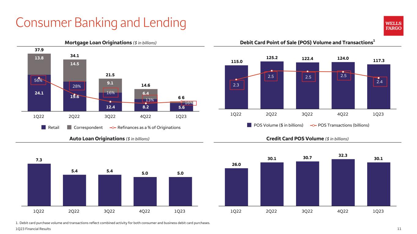 111Q23 Financial Results Consumer Banking and Lending Mortgage Loan Originations ($ in billions) Auto Loan Originations ($ in billions) Credit Card POS Volume ($ in billions) Debit Card Point of Sale (POS) Volume and Transactions1 1. Debit card purchase volume and transactions reflect combined activity for both consumer and business debit card purchases. 37.9 34.1 21.5 14.6 6.6 24.1 19.6 12.4 8.2 5.6 13.8 14.5 9.1 6.4 1 Retail Correspondent Refinances as a % of Originations 1Q22 2Q22 3Q22 4Q22 1Q23 115.0 125.2 122.4 124.0 117.3 POS Volume ($ in billions) POS Transactions (billions) 1Q22 2Q22 3Q22 4Q22 1Q23 7.3 5.4 5.4 5.0 5.0 1Q22 2Q22 3Q22 4Q22 1Q23 26.0 30.1 30.7 32.3 30.1 1Q22 2Q22 3Q22 4Q22 1Q23 2.3 2.5 2.5 2.5 2.456% 28% 16% 13% 16%