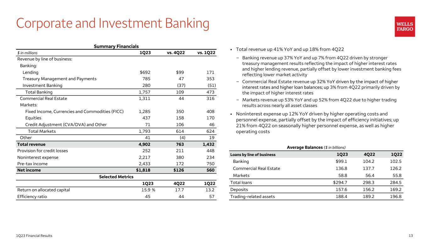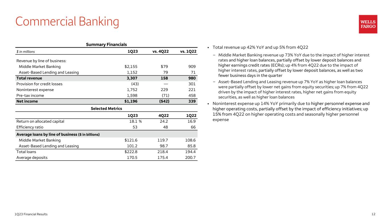 121Q23 Financial Results Commercial Banking • Total revenue up 42% YoY and up 5% from 4Q22 – Middle Market Banking revenue up 73% YoY due to the impact of higher interest rates and higher loan balances, partially offset by lower deposit balances and higher earnings credit rates (ECRs); up 4% from 4Q22 due to the impact of higher interest rates, partially offset by lower deposit balances, as well as two fewer business days in the quarter – Asset-Based Lending and Leasing revenue up 7% YoY as higher loan balances were partially offset by lower net gains from equity securities; up 7% from 4Q22 driven by the impact of higher interest rates, higher net gains from equity securities, as well as higher loan balances • Noninterest expense up 14% YoY primarily due to higher personnel expense and higher operating costs, partially offset by the impact of efficiency initiatives; up 15% from 4Q22 on higher operating costs and seasonally higher personnel expense Summary Financials $ in millions 1Q23 vs. 4Q22 vs. 1Q22 Revenue by line of business: Middle Market Banking $2,155 $79 909 Asset-Based Lending and Leasing 1,152 79 71 Total revenue 3,307 158 980 Provision for credit losses (43) — 301 Noninterest expense 1,752 229 221 Pre-tax income 1,598 (71) 458 Net income $1,196 ($42) 339 Selected Metrics 1Q23 4Q22 1Q22 Return on allocated capital 18.1 % 24.2 16.9 Efficiency ratio 53 48 66 Average loans by line of business ($ in billions) Middle Market Banking $121.6 119.7 108.6 Asset-Based Lending and Leasing 101.2 98.7 85.8 Total loans $222.8 218.4 194.4 Average deposits 170.5 175.4 200.7