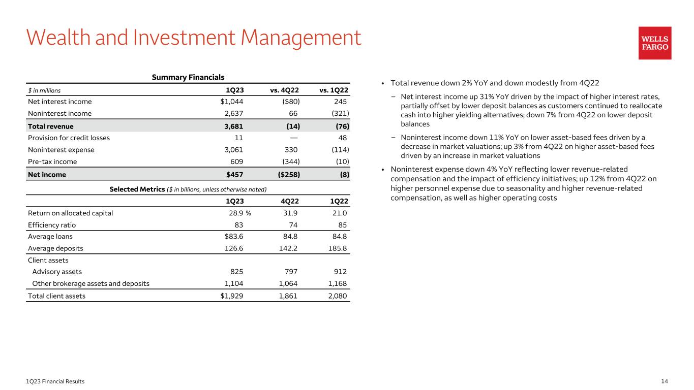 141Q23 Financial Results Wealth and Investment Management Summary Financials $ in millions 1Q23 vs. 4Q22 vs. 1Q22 Net interest income $1,044 ($80) 245 Noninterest income 2,637 66 (321) Total revenue 3,681 (14) (76) Provision for credit losses 11 — 48 Noninterest expense 3,061 330 (114) Pre-tax income 609 (344) (10) Net income $457 ($258) (8) Selected Metrics ($ in billions, unless otherwise noted) 1Q23 4Q22 1Q22 Return on allocated capital 28.9 % 31.9 21.0 Efficiency ratio 83 74 85 Average loans $83.6 84.8 84.8 Average deposits 126.6 142.2 185.8 Client assets Advisory assets 825 797 912 Other brokerage assets and deposits 1,104 1,064 1,168 Total client assets $1,929 1,861 2,080 • Total revenue down 2% YoY and down modestly from 4Q22 – Net interest income up 31% YoY driven by the impact of higher interest rates, partially offset by lower deposit balances as customers continued to reallocate cash into higher yielding alternatives; down 7% from 4Q22 on lower deposit balances – Noninterest income down 11% YoY on lower asset-based fees driven by a decrease in market valuations; up 3% from 4Q22 on higher asset-based fees driven by an increase in market valuations • Noninterest expense down 4% YoY reflecting lower revenue-related compensation and the impact of efficiency initiatives; up 12% from 4Q22 on higher personnel expense due to seasonality and higher revenue-related compensation, as well as higher operating costs