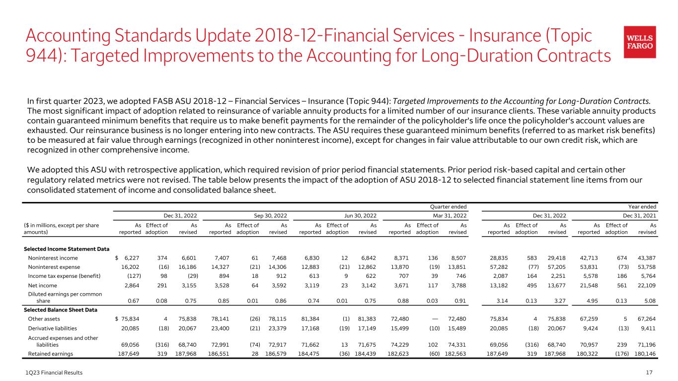 171Q23 Financial Results Accounting Standards Update 2018-12-Financial Services - Insurance (Topic 944): Targeted Improvements to the Accounting for Long-Duration Contracts Quarter ended Year ended Dec 31, 2022 Sep 30, 2022 Jun 30, 2022 Mar 31, 2022 Dec 31, 2022 Dec 31, 2021 ($ in millions, except per share amounts) As reported Effect of adoption As revised As reported Effect of adoption As revised As reported Effect of adoption As revised As reported Effect of adoption As revised As reported Effect of adoption As revised As reported Effect of adoption As revised Selected Income Statement Data Noninterest income $ 6,227 374 6,601 7,407 61 7,468 6,830 12 6,842 8,371 136 8,507 28,835 583 29,418 42,713 674 43,387 Noninterest expense 16,202 (16) 16,186 14,327 (21) 14,306 12,883 (21) 12,862 13,870 (19) 13,851 57,282 (77) 57,205 53,831 (73) 53,758 Income tax expense (benefit) (127) 98 (29) 894 18 912 613 9 622 707 39 746 2,087 164 2,251 5,578 186 5,764 Net income 2,864 291 3,155 3,528 64 3,592 3,119 23 3,142 3,671 117 3,788 13,182 495 13,677 21,548 561 22,109 Diluted earnings per common share 0.67 0.08 0.75 0.85 0.01 0.86 0.74 0.01 0.75 0.88 0.03 0.91 3.14 0.13 3.27 4.95 0.13 5.08 Selected Balance Sheet Data Other assets $ 75,834 4 75,838 78,141 (26) 78,115 81,384 (1) 81,383 72,480 — 72,480 75,834 4 75,838 67,259 5 67,264 Derivative liabilities 20,085 (18) 20,067 23,400 (21) 23,379 17,168 (19) 17,149 15,499 (10) 15,489 20,085 (18) 20,067 9,424 (13) 9,411 Accrued expenses and other liabilities 69,056 (316) 68,740 72,991 (74) 72,917 71,662 13 71,675 74,229 102 74,331 69,056 (316) 68,740 70,957 239 71,196 Retained earnings 187,649 319 187,968 186,551 28 186,579 184,475 (36) 184,439 182,623 (60) 182,563 187,649 319 187,968 180,322 (176) 180,146 In first quarter 2023, we adopted FASB ASU 2018-12 – Financial Services – Insurance (Topic 944): Targeted Improvements to the Accounting for Long-Duration Contracts. The most significant impact of adoption related to reinsurance of variable annuity products for a limited number of our insurance clients. These variable annuity products contain guaranteed minimum benefits that require us to make benefit payments for the remainder of the policyholder's life once the policyholder's account values are exhausted. Our reinsurance business is no longer entering into new contracts. The ASU requires these guaranteed minimum benefits (referred to as market risk benefits) to be measured at fair value through earnings (recognized in other noninterest income), except for changes in fair value attributable to our own credit risk, which are recognized in other comprehensive income. We adopted this ASU with retrospective application, which required revision of prior period financial statements. Prior period risk-based capital and certain other regulatory related metrics were not revised. The table below presents the impact of the adoption of ASU 2018-12 to selected financial statement line items from our consolidated statement of income and consolidated balance sheet.