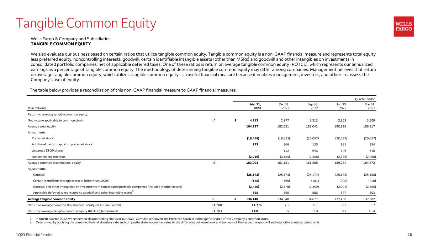 181Q23 Financial Results Tangible Common Equity Wells Fargo & Company and Subsidiaries TANGIBLE COMMON EQUITY We also evaluate our business based on certain ratios that utilize tangible common equity. Tangible common equity is a non-GAAP financial measure and represents total equity less preferred equity, noncontrolling interests, goodwill, certain identifiable intangible assets (other than MSRs) and goodwill and other intangibles on investments in consolidated portfolio companies, net of applicable deferred taxes. One of these ratios is return on average tangible common equity (ROTCE), which represents our annualized earnings as a percentage of tangible common equity. The methodology of determining tangible common equity may differ among companies. Management believes that return on average tangible common equity, which utilizes tangible common equity, is a useful financial measure because it enables management, investors, and others to assess the Company’s use of equity. The table below provides a reconciliation of this non-GAAP financial measure to GAAP financial measures. Quarter ended ($ in millions) Mar 31, 2023 Dec 31, 2022 Sep 30, 2022 Jun 30, 2022 Mar 31, 2022 Return on average tangible common equity: Net income applicable to common stock (A) $ 4,713 2,877 3,313 2,863 3,509 Average total equity 184,297 182,621 183,042 180,926 186,117 Adjustments: Preferred stock1 (19,448) (19,553) (20,057) (20,057) (20,057) Additional paid-in capital on preferred stock1 173 166 135 135 134 Unearned ESOP shares1 — 112 646 646 646 Noncontrolling interests (2,019) (2,185) (2,258) (2,386) (2,468) Average common stockholders’ equity (B) 163,003 161,161 161,508 159,264 164,372 Adjustments: Goodwill (25,173) (25,173) (25,177) (25,179) (25,180) Certain identifiable intangible assets (other than MSRs) (145) (160) (181) (200) (218) Goodwill and other intangibles on investments in consolidated portfolio companies (included in other assets) (2,440) (2,378) (2,359) (2,304) (2,395) Applicable deferred taxes related to goodwill and other intangible assets2 895 890 886 877 803 Average tangible common equity (C) $ 136,140 134,340 134,677 132,458 137,382 Return on average common stockholders’ equity (ROE) (annualized) (A)/(B) 11.7 % 7.1 8.1 7.2 8.7 Return on average tangible common equity (ROTCE) (annualized) (A)/(C) 14.0 8.5 9.8 8.7 10.4 1. In fourth quarter 2022, we redeemed all outstanding shares of our ESOP Cumulative Convertible Preferred Stock in exchange for shares of the Company’s common stock. 2. Determined by applying the combined federal statutory rate and composite state income tax rates to the difference between book and tax basis of the respective goodwill and intangible assets at period-end.