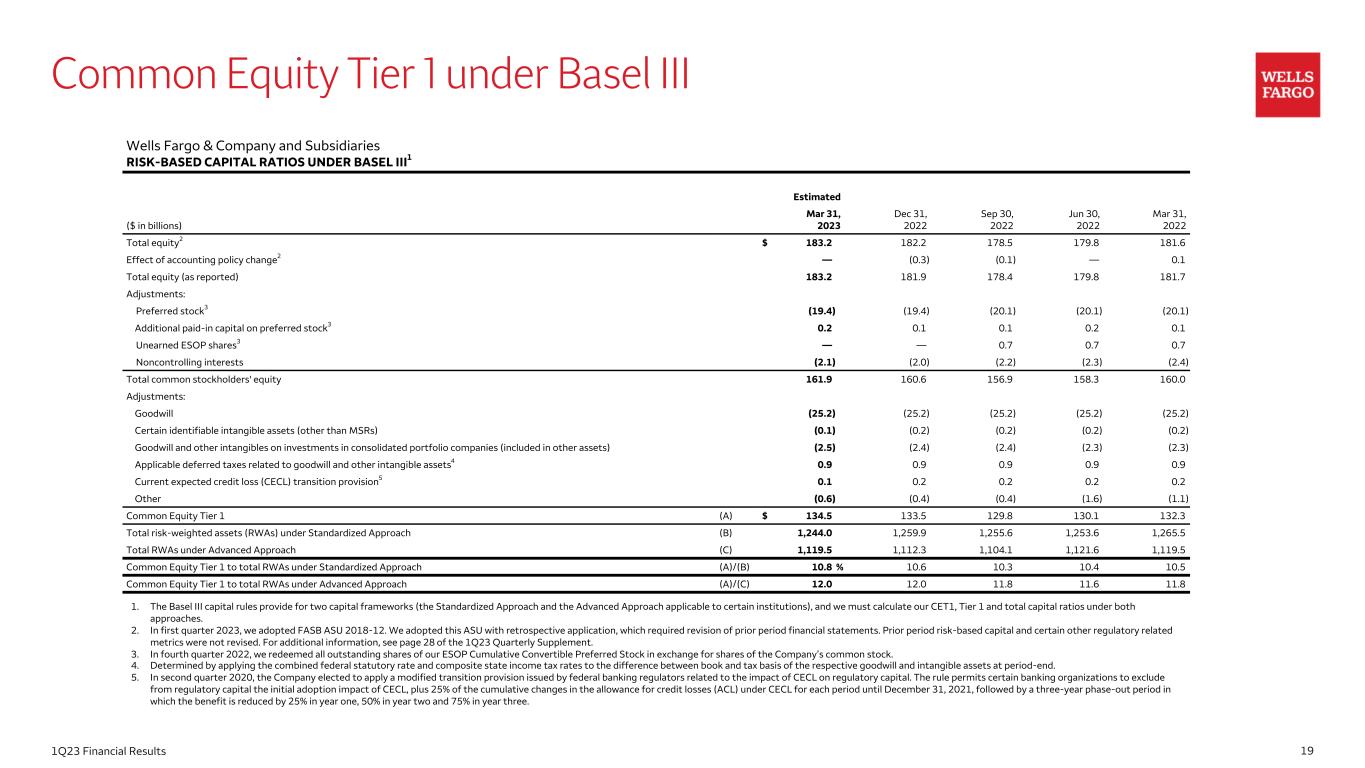 191Q23 Financial Results 1. The Basel III capital rules provide for two capital frameworks (the Standardized Approach and the Advanced Approach applicable to certain institutions), and we must calculate our CET1, Tier 1 and total capital ratios under both approaches. 2. In first quarter 2023, we adopted FASB ASU 2018-12. We adopted this ASU with retrospective application, which required revision of prior period financial statements. Prior period risk-based capital and certain other regulatory related metrics were not revised. For additional information, see page 28 of the 1Q23 Quarterly Supplement. 3. In fourth quarter 2022, we redeemed all outstanding shares of our ESOP Cumulative Convertible Preferred Stock in exchange for shares of the Company’s common stock. 4. Determined by applying the combined federal statutory rate and composite state income tax rates to the difference between book and tax basis of the respective goodwill and intangible assets at period-end. 5. In second quarter 2020, the Company elected to apply a modified transition provision issued by federal banking regulators related to the impact of CECL on regulatory capital. The rule permits certain banking organizations to exclude from regulatory capital the initial adoption impact of CECL, plus 25% of the cumulative changes in the allowance for credit losses (ACL) under CECL for each period until December 31, 2021, followed by a three-year phase-out period in which the benefit is reduced by 25% in year one, 50% in year two and 75% in year three. Common Equity Tier 1 under Basel III Wells Fargo & Company and Subsidiaries RISK-BASED CAPITAL RATIOS UNDER BASEL III1 Estimated ($ in billions) Mar 31, 2023 Dec 31, 2022 Sep 30, 2022 Jun 30, 2022 Mar 31, 2022 Total equity2 $ 183.2 182.2 178.5 179.8 181.6 Effect of accounting policy change2 — (0.3) (0.1) — 0.1 Total equity (as reported) 183.2 181.9 178.4 179.8 181.7 Adjustments: Preferred stock3 (19.4) (19.4) (20.1) (20.1) (20.1) Additional paid-in capital on preferred stock3 0.2 0.1 0.1 0.2 0.1 Unearned ESOP shares3 — — 0.7 0.7 0.7 Noncontrolling interests (2.1) (2.0) (2.2) (2.3) (2.4) Total common stockholders' equity 161.9 160.6 156.9 158.3 160.0 Adjustments: Goodwill (25.2) (25.2) (25.2) (25.2) (25.2) Certain identifiable intangible assets (other than MSRs) (0.1) (0.2) (0.2) (0.2) (0.2) Goodwill and other intangibles on investments in consolidated portfolio companies (included in other assets) (2.5) (2.4) (2.4) (2.3) (2.3) Applicable deferred taxes related to goodwill and other intangible assets4 0.9 0.9 0.9 0.9 0.9 Current expected credit loss (CECL) transition provision5 0.1 0.2 0.2 0.2 0.2 Other (0.6) (0.4) (0.4) (1.6) (1.1) Common Equity Tier 1 (A) $ 134.5 133.5 129.8 130.1 132.3 Total risk-weighted assets (RWAs) under Standardized Approach (B) 1,244.0 1,259.9 1,255.6 1,253.6 1,265.5 Total RWAs under Advanced Approach (C) 1,119.5 1,112.3 1,104.1 1,121.6 1,119.5 Common Equity Tier 1 to total RWAs under Standardized Approach (A)/(B) 10.8 % 10.6 10.3 10.4 10.5 Common Equity Tier 1 to total RWAs under Advanced Approach (A)/(C) 12.0 12.0 11.8 11.6 11.8