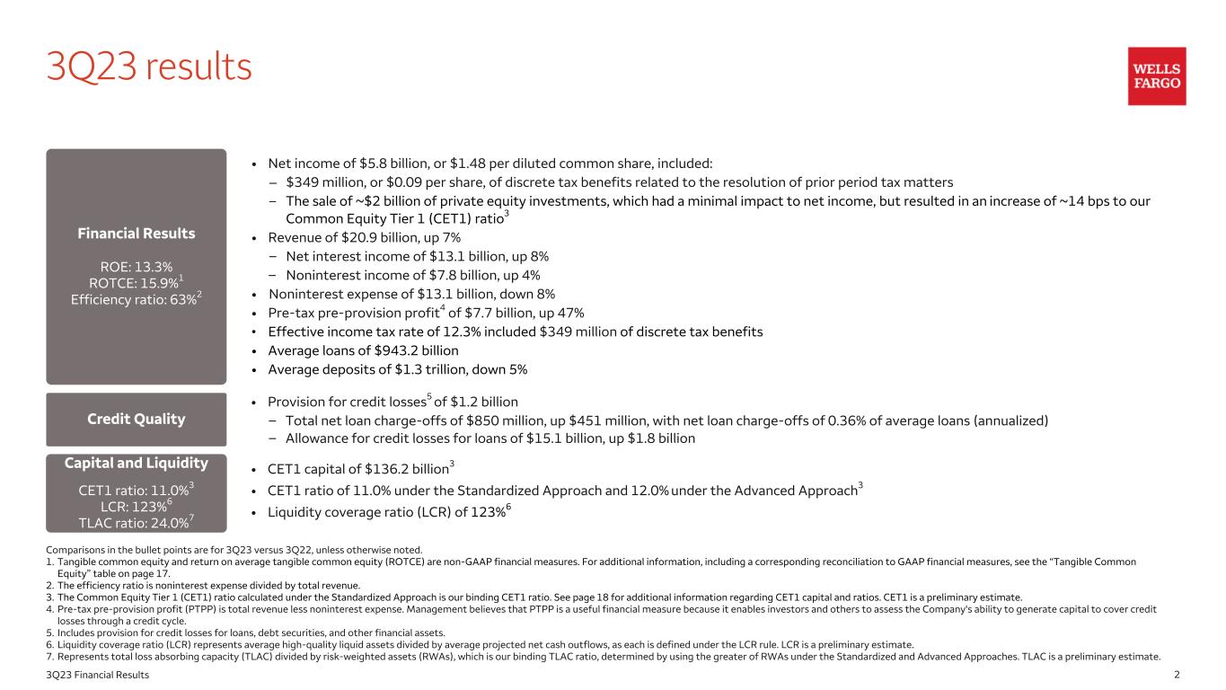 23Q23 Financial Results 3Q23 results Financial Results ROE: 13.3% ROTCE: 15.9%1 Efficiency ratio: 63%2 Credit Quality Capital and Liquidity CET1 ratio: 11.0%3 LCR: 123%6 TLAC ratio: 24.0%7 • Provision for credit losses5 of $1.2 billion – Total net loan charge-offs of $850 million, up $451 million, with net loan charge-offs of 0.36% of average loans (annualized) – Allowance for credit losses for loans of $15.1 billion, up $1.8 billion • CET1 capital of $136.2 billion3 • CET1 ratio of 11.0% under the Standardized Approach and 12.0% under the Advanced Approach3 • Liquidity coverage ratio (LCR) of 123%6 Comparisons in the bullet points are for 3Q23 versus 3Q22, unless otherwise noted. 1. Tangible common equity and return on average tangible common equity (ROTCE) are non-GAAP financial measures. For additional information, including a corresponding reconciliation to GAAP financial measures, see the “Tangible Common Equity” table on page 17. 2. The efficiency ratio is noninterest expense divided by total revenue. 3. The Common Equity Tier 1 (CET1) ratio calculated under the Standardized Approach is our binding CET1 ratio. See page 18 for additional information regarding CET1 capital and ratios. CET1 is a preliminary estimate. 4. Pre-tax pre-provision profit (PTPP) is total revenue less noninterest expense. Management believes that PTPP is a useful financial measure because it enables investors and others to assess the Company's ability to generate capital to cover credit losses through a credit cycle. 5. Includes provision for credit losses for loans, debt securities, and other financial assets. 6. Liquidity coverage ratio (LCR) represents average high-quality liquid assets divided by average projected net cash outflows, as each is defined under the LCR rule. LCR is a preliminary estimate. 7. Represents total loss absorbing capacity (TLAC) divided by risk-weighted assets (RWAs), which is our binding TLAC ratio, determined by using the greater of RWAs under the Standardized and Advanced Approaches. TLAC is a preliminary estimate. • Net income of $5.8 billion, or $1.48 per diluted common share, included: – $349 million, or $0.09 per share, of discrete tax benefits related to the resolution of prior period tax matters – The sale of ~$2 billion of private equity investments, which had a minimal impact to net income, but resulted in an increase of ~14 bps to our Common Equity Tier 1 (CET1) ratio3 • Revenue of $20.9 billion, up 7% – Net interest income of $13.1 billion, up 8% – Noninterest income of $7.8 billion, up 4% • Noninterest expense of $13.1 billion, down 8% • Pre-tax pre-provision profit4 of $7.7 billion, up 47% • Effective income tax rate of 12.3% included $349 million of discrete tax benefits • Average loans of $943.2 billion • Average deposits of $1.3 trillion, down 5%