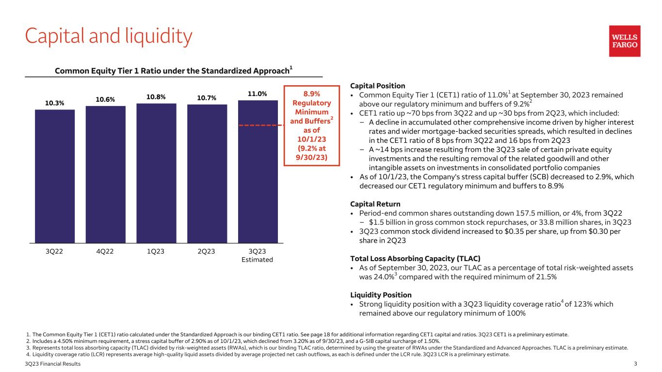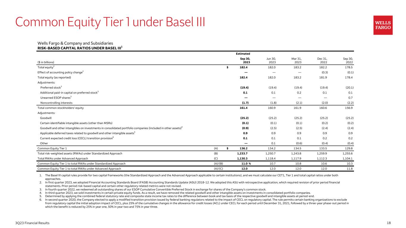 183Q23 Financial Results 1. The Basel III capital rules provide for two capital frameworks (the Standardized Approach and the Advanced Approach applicable to certain institutions), and we must calculate our CET1, Tier 1 and total capital ratios under both approaches. 2. In first quarter 2023, we adopted Financial Accounting Standards Board (FASB) Accounting Standards Update (ASU) 2018-12. We adopted this ASU with retrospective application, which required revision of prior period financial statements. Prior period risk-based capital and certain other regulatory related metrics were not revised. 3. In fourth quarter 2022, we redeemed all outstanding shares of our ESOP Cumulative Convertible Preferred Stock in exchange for shares of the Company’s common stock. 4. In third quarter 2023, we sold investments in certain private equity funds. As a result, we have removed the related goodwill and other intangible assets on investments in consolidated portfolio companies. 5. Determined by applying the combined federal statutory rate and composite state income tax rates to the difference between book and tax basis of the respective goodwill and intangible assets at period-end. 6. In second quarter 2020, the Company elected to apply a modified transition provision issued by federal banking regulators related to the impact of CECL on regulatory capital. The rule permits certain banking organizations to exclude from regulatory capital the initial adoption impact of CECL, plus 25% of the cumulative changes in the allowance for credit losses (ACL) under CECL for each period until December 31, 2021, followed by a three-year phase-out period in which the benefit is reduced by 25% in year one, 50% in year two and 75% in year three. Common Equity Tier 1 under Basel III Wells Fargo & Company and Subsidiaries RISK-BASED CAPITAL RATIOS UNDER BASEL III1 Estimated ($ in billions) Sep 30, 2023 Jun 30, 2023 Mar 31, 2023 Dec 31, 2022 Sep 30, 2022 Total equity2 $ 182.4 182.0 183.2 182.2 178.5 Effect of accounting policy change2 — — — (0.3) (0.1) Total equity (as reported) 182.4 182.0 183.2 181.9 178.4 Adjustments: Preferred stock3 (19.4) (19.4) (19.4) (19.4) (20.1) Additional paid-in capital on preferred stock3 0.1 0.1 0.2 0.1 0.1 Unearned ESOP shares3 — — — — 0.7 Noncontrolling interests (1.7) (1.8) (2.1) (2.0) (2.2) Total common stockholders' equity 161.4 160.9 161.9 160.6 156.9 Adjustments: Goodwill (25.2) (25.2) (25.2) (25.2) (25.2) Certain identifiable intangible assets (other than MSRs) (0.1) (0.1) (0.1) (0.2) (0.2) Goodwill and other intangibles on investments in consolidated portfolio companies (included in other assets)4 (0.9) (2.5) (2.5) (2.4) (2.4) Applicable deferred taxes related to goodwill and other intangible assets5 0.9 0.9 0.9 0.9 0.9 Current expected credit loss (CECL) transition provision6 0.1 0.1 0.1 0.2 0.2 Other — 0.1 (0.6) (0.4) (0.4) Common Equity Tier 1 (A) $ 136.2 134.2 134.5 133.5 129.8 Total risk-weighted assets (RWAs) under Standardized Approach (B) 1,233.7 1,250.7 1,243.8 1,259.9 1,255.6 Total RWAs under Advanced Approach (C) 1,130.3 1,118.4 1,117.9 1,112.3 1,104.1 Common Equity Tier 1 to total RWAs under Standardized Approach (A)/(B) 11.0 % 10.7 10.8 10.6 10.3 Common Equity Tier 1 to total RWAs under Advanced Approach (A)/(C) 12.0 12.0 12.0 12.0 11.8