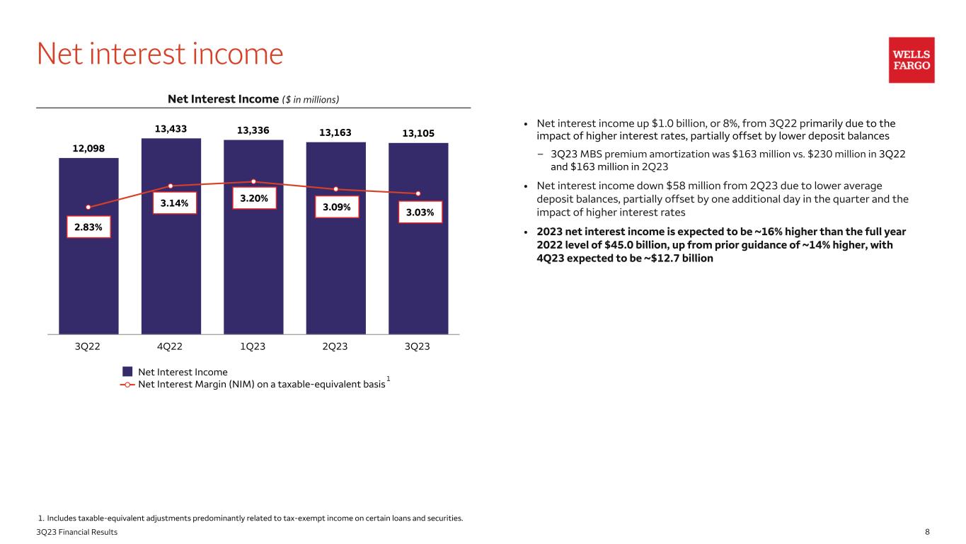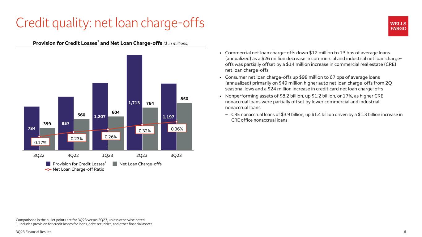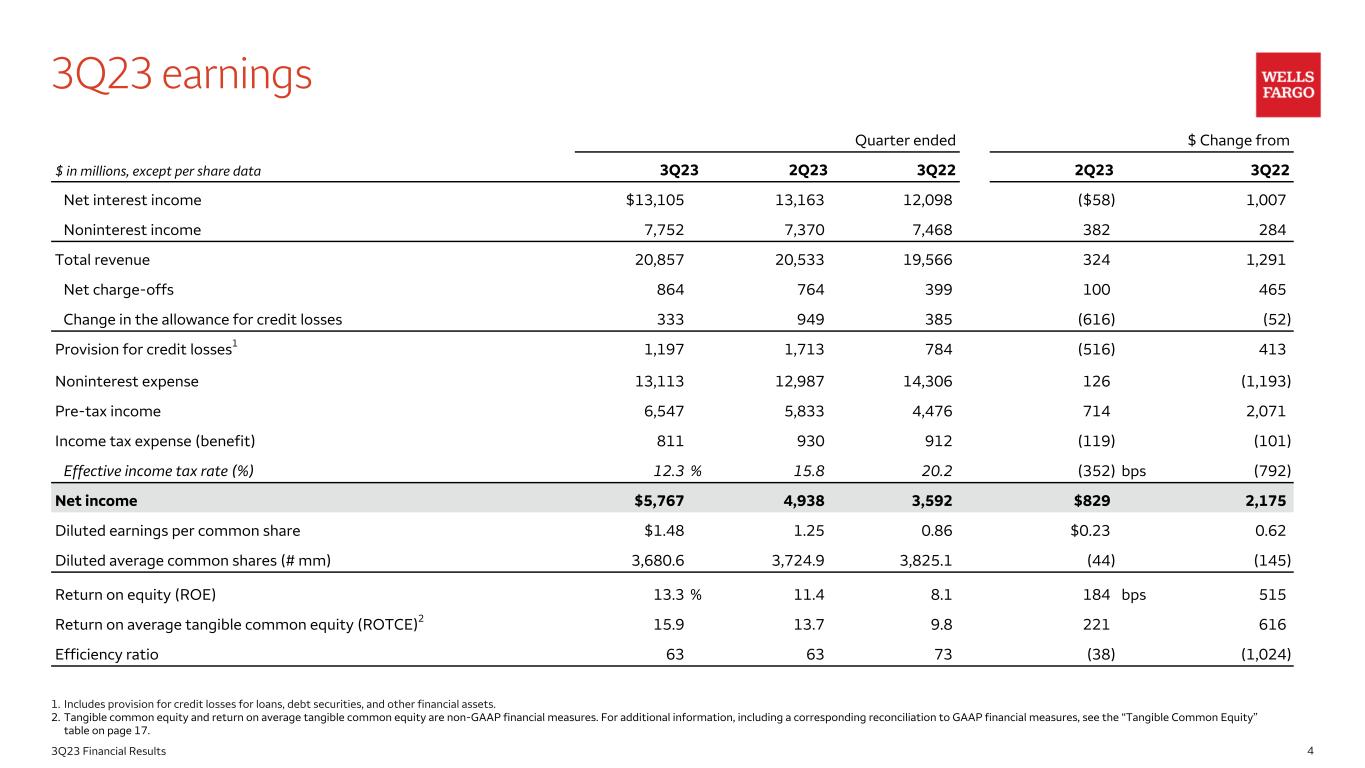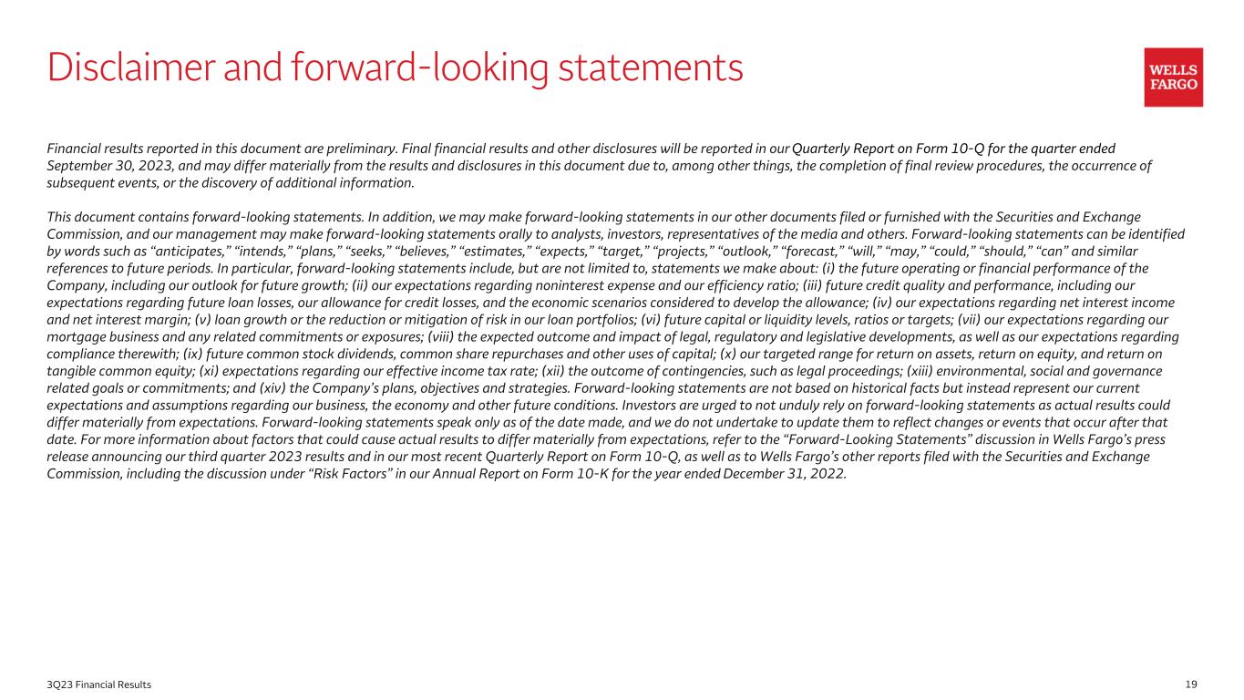 193Q23 Financial Results Disclaimer and forward-looking statements Financial results reported in this document are preliminary. Final financial results and other disclosures will be reported in our Quarterly Report on Form 10-Q for the quarter ended September 30, 2023, and may differ materially from the results and disclosures in this document due to, among other things, the completion of final review procedures, the occurrence of subsequent events, or the discovery of additional information. This document contains forward-looking statements. In addition, we may make forward-looking statements in our other documents filed or furnished with the Securities and Exchange Commission, and our management may make forward-looking statements orally to analysts, investors, representatives of the media and others. Forward-looking statements can be identified by words such as “anticipates,” “intends,” “plans,” “seeks,” “believes,” “estimates,” “expects,” “target,” “projects,” “outlook,” “forecast,” “will,” “may,” “could,” “should,” “can” and similar references to future periods. In particular, forward-looking statements include, but are not limited to, statements we make about: (i) the future operating or financial performance of the Company, including our outlook for future growth; (ii) our expectations regarding noninterest expense and our efficiency ratio; (iii) future credit quality and performance, including our expectations regarding future loan losses, our allowance for credit losses, and the economic scenarios considered to develop the allowance; (iv) our expectations regarding net interest income and net interest margin; (v) loan growth or the reduction or mitigation of risk in our loan portfolios; (vi) future capital or liquidity levels, ratios or targets; (vii) our expectations regarding our mortgage business and any related commitments or exposures; (viii) the expected outcome and impact of legal, regulatory and legislative developments, as well as our expectations regarding compliance therewith; (ix) future common stock dividends, common share repurchases and other uses of capital; (x) our targeted range for return on assets, return on equity, and return on tangible common equity; (xi) expectations regarding our effective income tax rate; (xii) the outcome of contingencies, such as legal proceedings; (xiii) environmental, social and governance related goals or commitments; and (xiv) the Company’s plans, objectives and strategies. Forward-looking statements are not based on historical facts but instead represent our current expectations and assumptions regarding our business, the economy and other future conditions. Investors are urged to not unduly rely on forward-looking statements as actual results could differ materially from expectations. Forward-looking statements speak only as of the date made, and we do not undertake to update them to reflect changes or events that occur after that date. For more information about factors that could cause actual results to differ materially from expectations, refer to the “Forward-Looking Statements” discussion in Wells Fargo’s press release announcing our third quarter 2023 results and in our most recent Quarterly Report on Form 10-Q, as well as to Wells Fargo’s other reports filed with the Securities and Exchange Commission, including the discussion under “Risk Factors” in our Annual Report on Form 10-K for the year ended December 31, 2022.