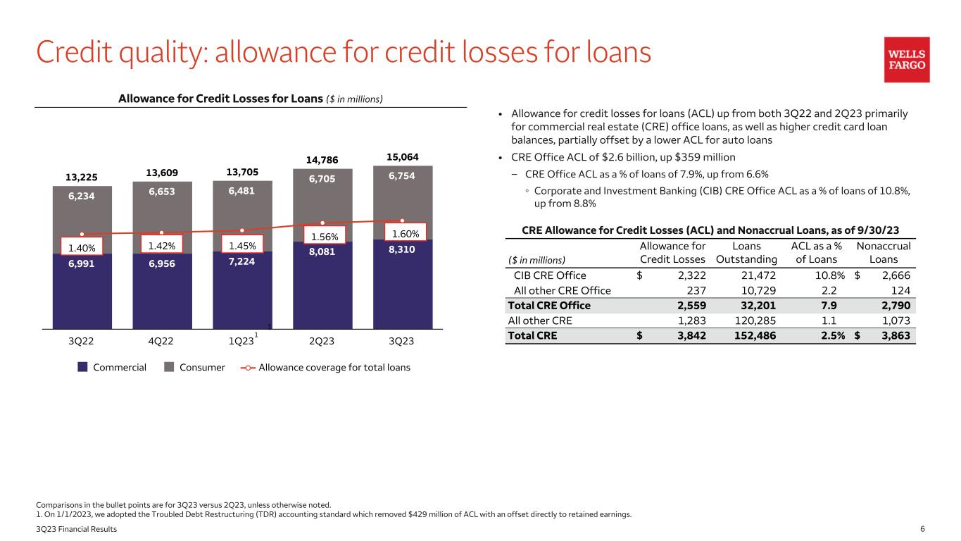 53Q23 Financial Results Credit quality: net loan charge-offs • Commercial net loan charge-offs down $12 million to 13 bps of average loans (annualized) as a $26 million decrease in commercial and industrial net loan charge- offs was partially offset by a $14 million increase in commercial real estate (CRE) net loan charge-offs • Consumer net loan charge-offs up $98 million to 67 bps of average loans (annualized) primarily on $49 million higher auto net loan charge-offs from 2Q seasonal lows and a $24 million increase in credit card net loan charge-offs • Nonperforming assets of $8.2 billion, up $1.2 billion, or 17%, as higher CRE nonaccrual loans were partially offset by lower commercial and industrial nonaccrual loans – CRE nonaccrual loans of $3.9 billion, up $1.4 billion driven by a $1.3 billion increase in CRE office nonaccrual loans Provision for Credit Losses1 and Net Loan Charge-offs ($ in millions) Comparisons in the bullet points are for 3Q23 versus 2Q23, unless otherwise noted. 1. Includes provision for credit losses for loans, debt securities, and other financial assets. 784 957 1,207 1,713 1,197 399 560 604 764 850 Provision for Credit Losses Net Loan Charge-offs Net Loan Charge-off Ratio 3Q22 4Q22 1Q23 2Q23 3Q23 0.17% 0.23% 0.32% 0.26% 0.36% 1 1