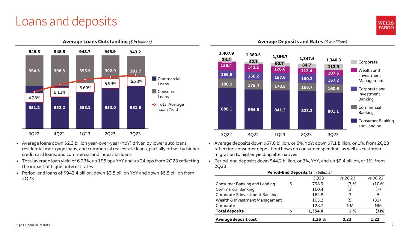 73Q23 Financial Results Loans and deposits • Average loans down $2.3 billion year-over-year (YoY) driven by lower auto loans, residential mortgage loans, and commercial real estate loans, partially offset by higher credit card loans, and commercial and industrial loans • Total average loan yield of 6.23%, up 195 bps YoY and up 24 bps from 2Q23 reflecting the impact of higher interest rates • Period-end loans of $942.4 billion, down $3.5 billion YoY and down $5.5 billion from 2Q23 • Average deposits down $67.6 billion, or 5%, YoY; down $7.1 billion, or 1%, from 2Q23 reflecting consumer deposit outflows on consumer spending, as well as customer migration to higher yielding alternatives • Period-end deposits down $44.2 billion, or 3%, YoY, and up $9.4 billion, or 1%, from 2Q23 Average Loans Outstanding ($ in billions) Average Deposits and Rates ($ in billions) 945.5 948.5 948.7 945.9 943.2 551.2 552.2 553.2 553.0 551.5 394.3 396.3 395.5 392.9 391.7 Commercial Loans Consumer Loans Total Average Loan Yield 3Q22 4Q22 1Q23 2Q23 3Q23 4.28% 5.13% 5.69% 5.99% 6.23% Period-End Deposits ($ in billions) 3Q23 vs 2Q23 vs 3Q22 Consumer Banking and Lending $ 798.9 (3) % (10) % Commercial Banking 160.4 (3) (7) Corporate & Investment Banking 162.8 3 5 Wealth & Investment Management 103.2 (5) (31) Corporate 128.7 NM NM Total deposits $ 1,354.0 1 % (3) % Average deposit cost 1.36 % 0.23 1.22 888.1 864.6 841.3 823.3 801.1 180.2 175.4 170.5 166.7 160.6 156.8 156.2 157.6 160.3 157.2 Corporate Wealth and Investment Management Corporate and Investment Banking Commercial Banking Consumer Banking and Lending 3Q22 4Q22 1Q23 2Q23 3Q23 1,380.51,407.9 1,356.7 1,347.4 1,340.324.4 42.1 60.7 84.7 113.9158.4 142.2 126.6 112.4 107.5