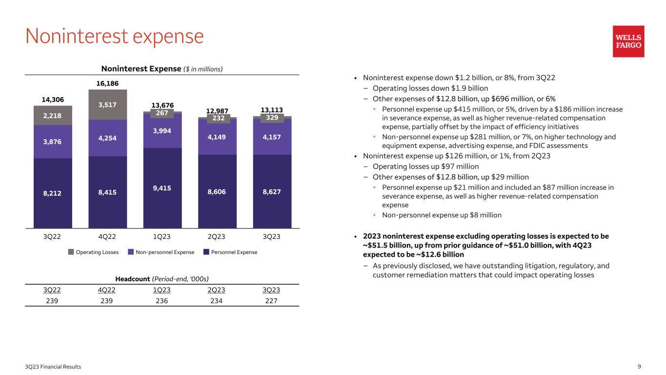 93Q23 Financial Results Noninterest expense • Noninterest expense down $1.2 billion, or 8%, from 3Q22 – Operating losses down $1.9 billion – Other expenses of $12.8 billion, up $696 million, or 6% ◦ Personnel expense up $415 million, or 5%, driven by a $186 million increase in severance expense, as well as higher revenue-related compensation expense, partially offset by the impact of efficiency initiatives ◦ Non-personnel expense up $281 million, or 7%, on higher technology and equipment expense, advertising expense, and FDIC assessments • Noninterest expense up $126 million, or 1%, from 2Q23 – Operating losses up $97 million – Other expenses of $12.8 billion, up $29 million ◦ Personnel expense up $21 million and included an $87 million increase in severance expense, as well as higher revenue-related compensation expense ◦ Non-personnel expense up $8 million • 2023 noninterest expense excluding operating losses is expected to be ~$51.5 billion, up from prior guidance of ~$51.0 billion, with 4Q23 expected to be ~$12.6 billion – As previously disclosed, we have outstanding litigation, regulatory, and customer remediation matters that could impact operating losses Noninterest Expense ($ in millions) 14,306 16,186 13,676 12,987 13,113 8,212 8,415 9,415 8,606 8,627 3,876 4,254 3,994 4,149 4,157 2,218 3,517 Operating Losses Non-personnel Expense Personnel Expense 3Q22 4Q22 1Q23 2Q23 3Q23 Headcount (Period-end, '000s) 3Q22 4Q22 1Q23 2Q23 3Q23 239 239 236 234 227 329232 267
