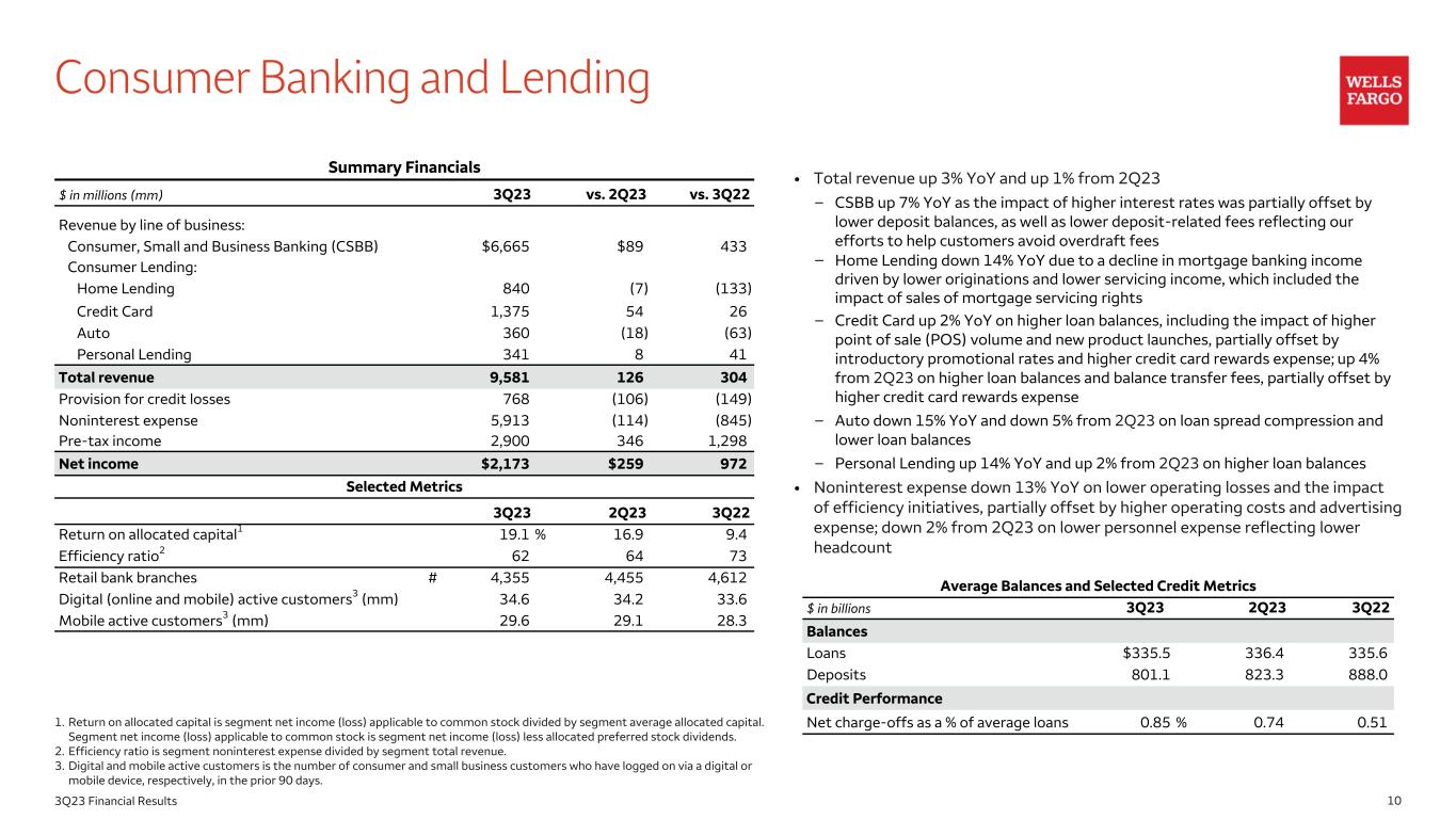 103Q23 Financial Results Consumer Banking and Lending • Total revenue up 3% YoY and up 1% from 2Q23 – CSBB up 7% YoY as the impact of higher interest rates was partially offset by lower deposit balances, as well as lower deposit-related fees reflecting our efforts to help customers avoid overdraft fees – Home Lending down 14% YoY due to a decline in mortgage banking income driven by lower originations and lower servicing income, which included the impact of sales of mortgage servicing rights – Credit Card up 2% YoY on higher loan balances, including the impact of higher point of sale (POS) volume and new product launches, partially offset by introductory promotional rates and higher credit card rewards expense; up 4% from 2Q23 on higher loan balances and balance transfer fees, partially offset by higher credit card rewards expense – Auto down 15% YoY and down 5% from 2Q23 on loan spread compression and lower loan balances – Personal Lending up 14% YoY and up 2% from 2Q23 on higher loan balances • Noninterest expense down 13% YoY on lower operating losses and the impact of efficiency initiatives, partially offset by higher operating costs and advertising expense; down 2% from 2Q23 on lower personnel expense reflecting lower headcount 1. Return on allocated capital is segment net income (loss) applicable to common stock divided by segment average allocated capital. Segment net income (loss) applicable to common stock is segment net income (loss) less allocated preferred stock dividends. 2. Efficiency ratio is segment noninterest expense divided by segment total revenue. 3. Digital and mobile active customers is the number of consumer and small business customers who have logged on via a digital or mobile device, respectively, in the prior 90 days. Summary Financials $ in millions (mm) 3Q23 vs. 2Q23 vs. 3Q22 Revenue by line of business: Consumer, Small and Business Banking (CSBB) $6,665 $89 433 Consumer Lending: Home Lending 840 (7) (133) Credit Card 1,375 54 26 Auto 360 (18) (63) Personal Lending 341 8 41 Total revenue 9,581 126 304 Provision for credit losses 768 (106) (149) Noninterest expense 5,913 (114) (845) Pre-tax income 2,900 346 1,298 Net income $2,173 $259 972 Selected Metrics 3Q23 2Q23 3Q22 Return on allocated capital1 19.1 % 16.9 9.4 Efficiency ratio2 62 64 73 Retail bank branches # 4,355 4,455 4,612 Digital (online and mobile) active customers3 (mm) 34.6 34.2 33.6 Mobile active customers3 (mm) 29.6 29.1 28.3 Average Balances and Selected Credit Metrics $ in billions 3Q23 2Q23 3Q22 Balances Loans $335.5 336.4 335.6 Deposits 801.1 823.3 888.0 Credit Performance Net charge-offs as a % of average loans 0.85 % 0.74 0.51