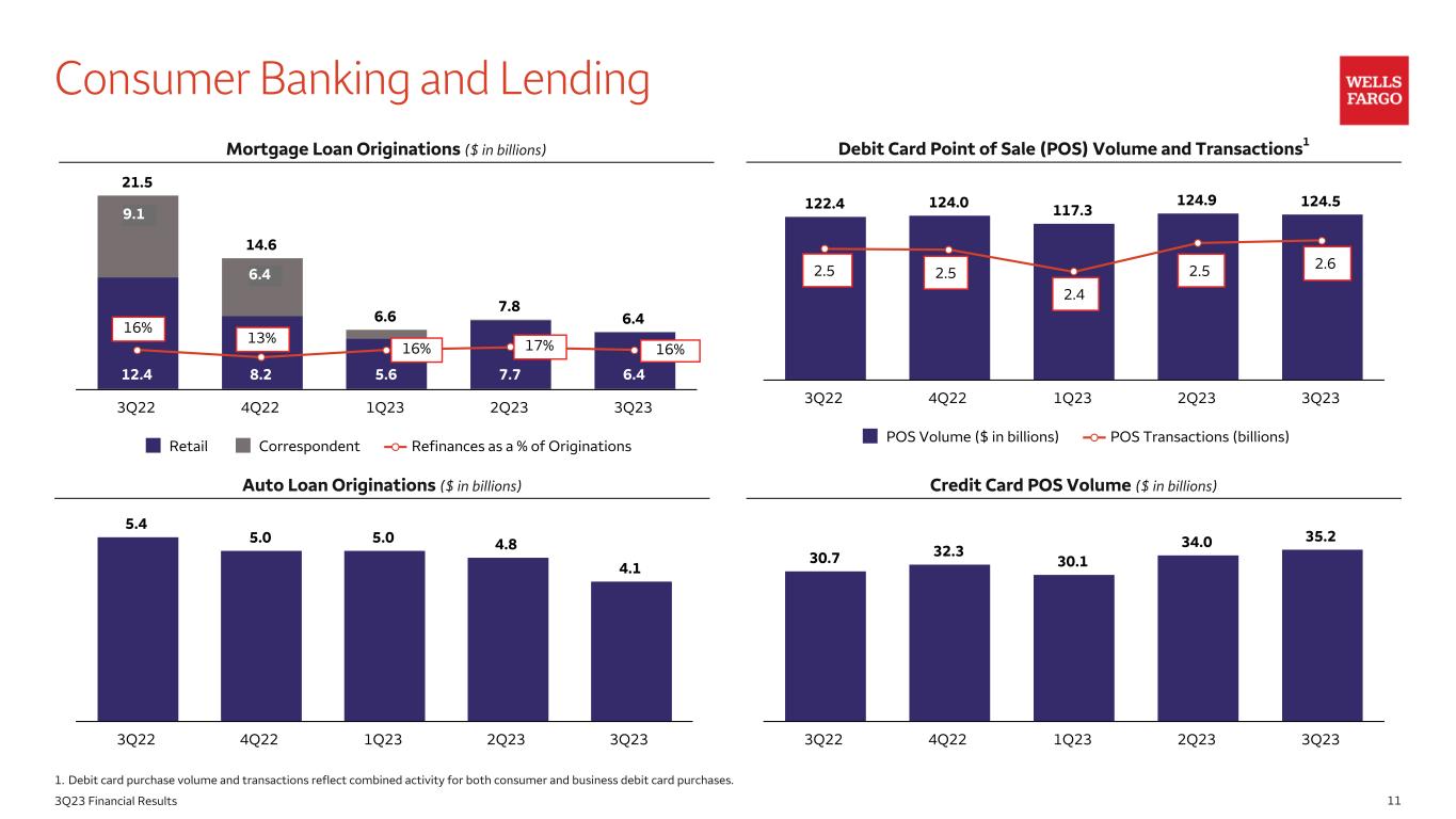 113Q23 Financial Results Consumer Banking and Lending Mortgage Loan Originations ($ in billions) Auto Loan Originations ($ in billions) Credit Card POS Volume ($ in billions) Debit Card Point of Sale (POS) Volume and Transactions1 1. Debit card purchase volume and transactions reflect combined activity for both consumer and business debit card purchases. 21.5 14.6 6.6 7.8 6.4 12.4 8.2 5.6 7.7 6.4 Retail Correspondent Refinances as a % of Originations 3Q22 4Q22 1Q23 2Q23 3Q23 122.4 124.0 117.3 124.9 124.5 POS Volume ($ in billions) POS Transactions (billions) 3Q22 4Q22 1Q23 2Q23 3Q23 5.4 5.0 5.0 4.8 4.1 3Q22 4Q22 1Q23 2Q23 3Q23 30.7 32.3 30.1 34.0 35.2 3Q22 4Q22 1Q23 2Q23 3Q23 2.5 2.5 2.4 2.5 2.6 16% 13% 16% 17% 16% 9.1 6.4