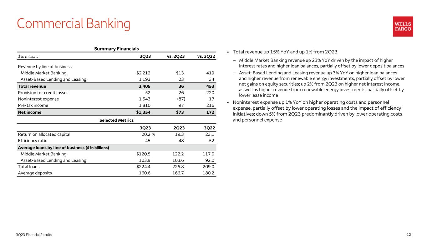 123Q23 Financial Results Commercial Banking • Total revenue up 15% YoY and up 1% from 2Q23 – Middle Market Banking revenue up 23% YoY driven by the impact of higher interest rates and higher loan balances, partially offset by lower deposit balances – Asset-Based Lending and Leasing revenue up 3% YoY on higher loan balances and higher revenue from renewable energy investments, partially offset by lower net gains on equity securities; up 2% from 2Q23 on higher net interest income, as well as higher revenue from renewable energy investments, partially offset by lower lease income • Noninterest expense up 1% YoY on higher operating costs and personnel expense, partially offset by lower operating losses and the impact of efficiency initiatives; down 5% from 2Q23 predominantly driven by lower operating costs and personnel expense Summary Financials $ in millions 3Q23 vs. 2Q23 vs. 3Q22 Revenue by line of business: Middle Market Banking $2,212 $13 419 Asset-Based Lending and Leasing 1,193 23 34 Total revenue 3,405 36 453 Provision for credit losses 52 26 220 Noninterest expense 1,543 (87) 17 Pre-tax income 1,810 97 216 Net income $1,354 $73 172 Selected Metrics 3Q23 2Q23 3Q22 Return on allocated capital 20.2 % 19.3 23.1 Efficiency ratio 45 48 52 Average loans by line of business ($ in billions) Middle Market Banking $120.5 122.2 117.0 Asset-Based Lending and Leasing 103.9 103.6 92.0 Total loans $224.4 225.8 209.0 Average deposits 160.6 166.7 180.2