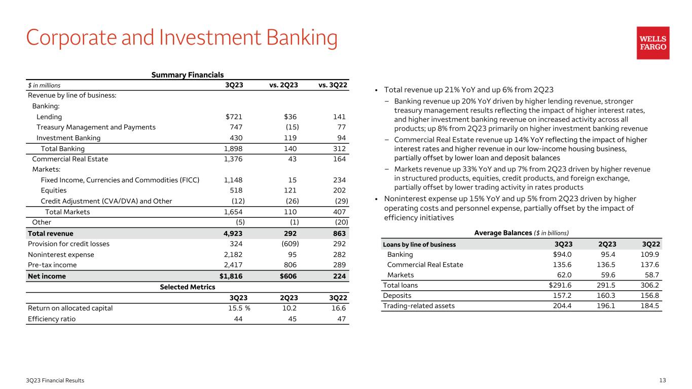 133Q23 Financial Results Corporate and Investment Banking • Total revenue up 21% YoY and up 6% from 2Q23 – Banking revenue up 20% YoY driven by higher lending revenue, stronger treasury management results reflecting the impact of higher interest rates, and higher investment banking revenue on increased activity across all products; up 8% from 2Q23 primarily on higher investment banking revenue – Commercial Real Estate revenue up 14% YoY reflecting the impact of higher interest rates and higher revenue in our low-income housing business, partially offset by lower loan and deposit balances – Markets revenue up 33% YoY and up 7% from 2Q23 driven by higher revenue in structured products, equities, credit products, and foreign exchange, partially offset by lower trading activity in rates products • Noninterest expense up 15% YoY and up 5% from 2Q23 driven by higher operating costs and personnel expense, partially offset by the impact of efficiency initiatives Summary Financials $ in millions 3Q23 vs. 2Q23 vs. 3Q22 Revenue by line of business: Banking: Lending $721 $36 141 Treasury Management and Payments 747 (15) 77 Investment Banking 430 119 94 Total Banking 1,898 140 312 Commercial Real Estate 1,376 43 164 Markets: Fixed Income, Currencies and Commodities (FICC) 1,148 15 234 Equities 518 121 202 Credit Adjustment (CVA/DVA) and Other (12) (26) (29) Total Markets 1,654 110 407 Other (5) (1) (20) Total revenue 4,923 292 863 Provision for credit losses 324 (609) 292 Noninterest expense 2,182 95 282 Pre-tax income 2,417 806 289 Net income $1,816 $606 224 Selected Metrics 3Q23 2Q23 3Q22 Return on allocated capital 15.5 % 10.2 16.6 Efficiency ratio 44 45 47 Average Balances ($ in billions) Loans by line of business 3Q23 2Q23 3Q22 Banking $94.0 95.4 109.9 Commercial Real Estate 135.6 136.5 137.6 Markets 62.0 59.6 58.7 Total loans $291.6 291.5 306.2 Deposits 157.2 160.3 156.8 Trading-related assets 204.4 196.1 184.5