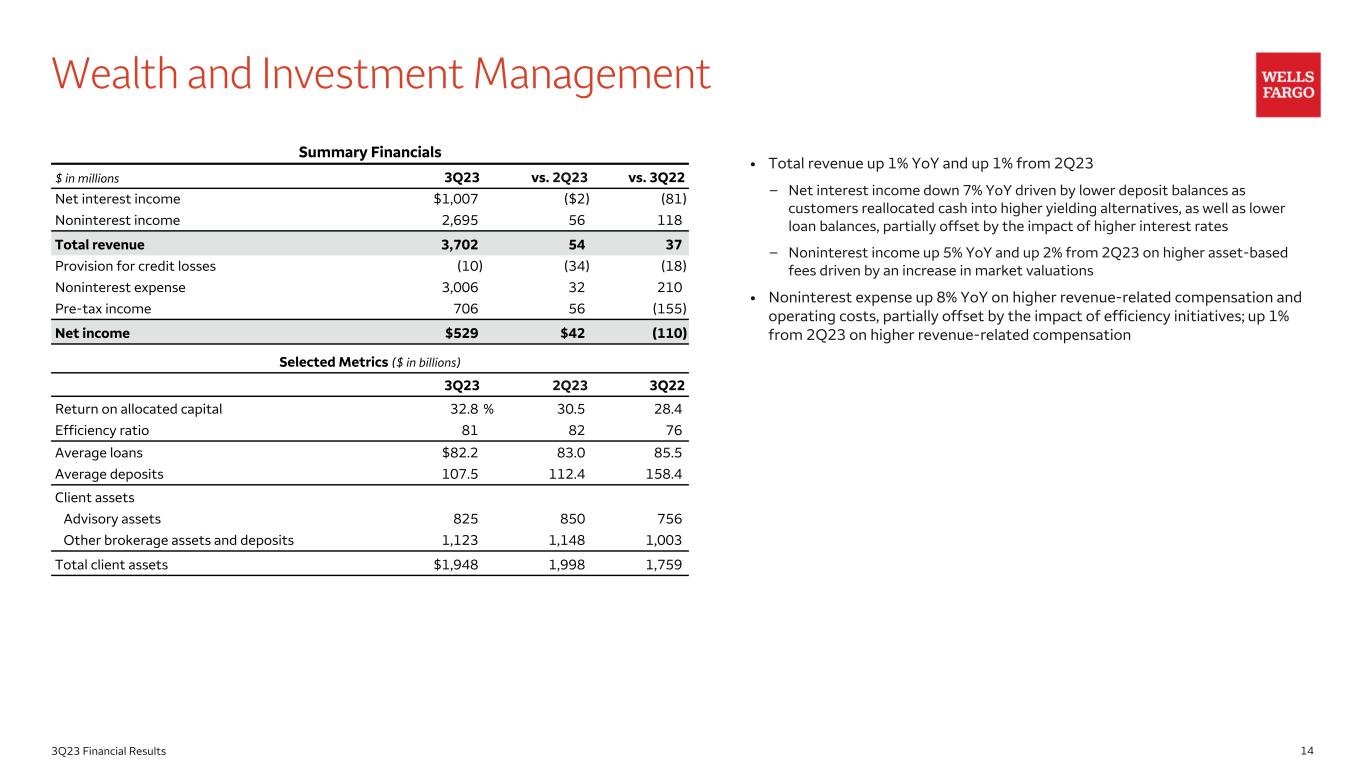 143Q23 Financial Results Wealth and Investment Management Summary Financials $ in millions 3Q23 vs. 2Q23 vs. 3Q22 Net interest income $1,007 ($2) (81) Noninterest income 2,695 56 118 Total revenue 3,702 54 37 Provision for credit losses (10) (34) (18) Noninterest expense 3,006 32 210 Pre-tax income 706 56 (155) Net income $529 $42 (110) Selected Metrics ($ in billions) 3Q23 2Q23 3Q22 Return on allocated capital 32.8 % 30.5 28.4 Efficiency ratio 81 82 76 Average loans $82.2 83.0 85.5 Average deposits 107.5 112.4 158.4 Client assets Advisory assets 825 850 756 Other brokerage assets and deposits 1,123 1,148 1,003 Total client assets $1,948 1,998 1,759 • Total revenue up 1% YoY and up 1% from 2Q23 – Net interest income down 7% YoY driven by lower deposit balances as customers reallocated cash into higher yielding alternatives, as well as lower loan balances, partially offset by the impact of higher interest rates – Noninterest income up 5% YoY and up 2% from 2Q23 on higher asset-based fees driven by an increase in market valuations • Noninterest expense up 8% YoY on higher revenue-related compensation and operating costs, partially offset by the impact of efficiency initiatives; up 1% from 2Q23 on higher revenue-related compensation