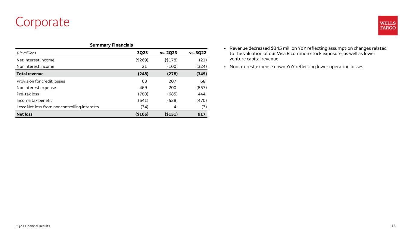 153Q23 Financial Results Corporate • Revenue decreased $345 million YoY reflecting assumption changes related to the valuation of our Visa B common stock exposure, as well as lower venture capital revenue • Noninterest expense down YoY reflecting lower operating losses Summary Financials $ in millions 3Q23 vs. 2Q23 vs. 3Q22 Net interest income ($269) ($178) (21) Noninterest income 21 (100) (324) Total revenue (248) (278) (345) Provision for credit losses 63 207 68 Noninterest expense 469 200 (857) Pre-tax loss (780) (685) 444 Income tax benefit (641) (538) (470) Less: Net loss from noncontrolling interests (34) 4 (3) Net loss ($105) ($151) 917