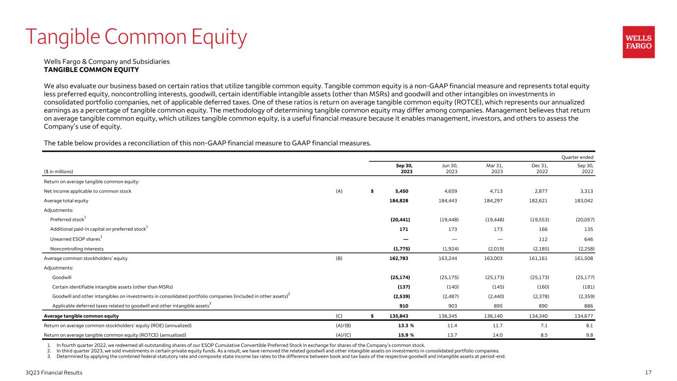 173Q23 Financial Results Tangible Common Equity Wells Fargo & Company and Subsidiaries TANGIBLE COMMON EQUITY We also evaluate our business based on certain ratios that utilize tangible common equity. Tangible common equity is a non-GAAP financial measure and represents total equity less preferred equity, noncontrolling interests, goodwill, certain identifiable intangible assets (other than MSRs) and goodwill and other intangibles on investments in consolidated portfolio companies, net of applicable deferred taxes. One of these ratios is return on average tangible common equity (ROTCE), which represents our annualized earnings as a percentage of tangible common equity. The methodology of determining tangible common equity may differ among companies. Management believes that return on average tangible common equity, which utilizes tangible common equity, is a useful financial measure because it enables management, investors, and others to assess the Company’s use of equity. The table below provides a reconciliation of this non-GAAP financial measure to GAAP financial measures. Quarter ended ($ in millions) Sep 30, 2023 Jun 30, 2023 Mar 31, 2023 Dec 31, 2022 Sep 30, 2022 Return on average tangible common equity: Net income applicable to common stock (A) $ 5,450 4,659 4,713 2,877 3,313 Average total equity 184,828 184,443 184,297 182,621 183,042 Adjustments: Preferred stock1 (20,441) (19,448) (19,448) (19,553) (20,057) Additional paid-in capital on preferred stock1 171 173 173 166 135 Unearned ESOP shares1 — — — 112 646 Noncontrolling interests (1,775) (1,924) (2,019) (2,185) (2,258) Average common stockholders’ equity (B) 162,783 163,244 163,003 161,161 161,508 Adjustments: Goodwill (25,174) (25,175) (25,173) (25,173) (25,177) Certain identifiable intangible assets (other than MSRs) (137) (140) (145) (160) (181) Goodwill and other intangibles on investments in consolidated portfolio companies (included in other assets)2 (2,539) (2,487) (2,440) (2,378) (2,359) Applicable deferred taxes related to goodwill and other intangible assets3 910 903 895 890 886 Average tangible common equity (C) $ 135,843 136,345 136,140 134,340 134,677 Return on average common stockholders’ equity (ROE) (annualized) (A)/(B) 13.3 % 11.4 11.7 7.1 8.1 Return on average tangible common equity (ROTCE) (annualized) (A)/(C) 15.9 % 13.7 14.0 8.5 9.8 1. In fourth quarter 2022, we redeemed all outstanding shares of our ESOP Cumulative Convertible Preferred Stock in exchange for shares of the Company’s common stock. 2. In third quarter 2023, we sold investments in certain private equity funds. As a result, we have removed the related goodwill and other intangible assets on investments in consolidated portfolio companies. 3. Determined by applying the combined federal statutory rate and composite state income tax rates to the difference between book and tax basis of the respective goodwill and intangible assets at period-end.