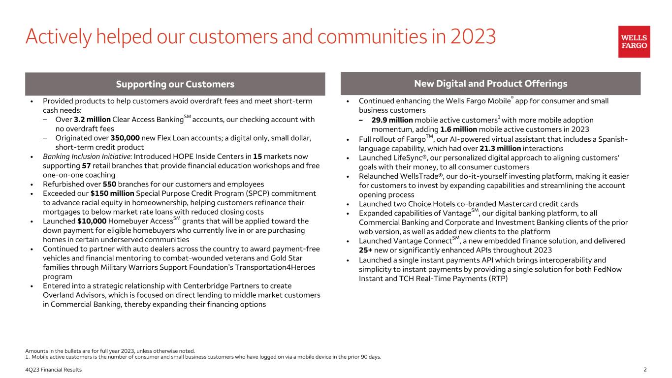 24Q23 Financial Results • Provided products to help customers avoid overdraft fees and meet short-term cash needs: – Over 3.2 million Clear Access BankingSM accounts, our checking account with no overdraft fees – Originated over 350,000 new Flex Loan accounts; a digital only, small dollar, short-term credit product • Banking Inclusion Initiative: Introduced HOPE Inside Centers in 15 markets now supporting 57 retail branches that provide financial education workshops and free one-on-one coaching • Refurbished over 550 branches for our customers and employees • Exceeded our $150 million Special Purpose Credit Program (SPCP) commitment to advance racial equity in homeownership, helping customers refinance their mortgages to below market rate loans with reduced closing costs • Launched $10,000 Homebuyer AccessSM grants that will be applied toward the down payment for eligible homebuyers who currently live in or are purchasing homes in certain underserved communities • Continued to partner with auto dealers across the country to award payment-free vehicles and financial mentoring to combat-wounded veterans and Gold Star families through Military Warriors Support Foundation’s Transportation4Heroes program • Entered into a strategic relationship with Centerbridge Partners to create Overland Advisors, which is focused on direct lending to middle market customers in Commercial Banking, thereby expanding their financing options Actively helped our customers and communities in 2023 Supporting our Customers • Continued enhancing the Wells Fargo Mobile® app for consumer and small business customers – 29.9 million mobile active customers1 with more mobile adoption momentum, adding 1.6 million mobile active customers in 2023 • Full rollout of FargoTM, our AI-powered virtual assistant that includes a Spanish- language capability, which had over 21.3 million interactions • Launched LifeSync®, our personalized digital approach to aligning customers' goals with their money, to all consumer customers • Relaunched WellsTrade®, our do-it-yourself investing platform, making it easier for customers to invest by expanding capabilities and streamlining the account opening process • Launched two Choice Hotels co-branded Mastercard credit cards • Expanded capabilities of VantageSM, our digital banking platform, to all Commercial Banking and Corporate and Investment Banking clients of the prior web version, as well as added new clients to the platform • Launched Vantage ConnectSM, a new embedded finance solution, and delivered 25+ new or significantly enhanced APIs throughout 2023 • Launched a single instant payments API which brings interoperability and simplicity to instant payments by providing a single solution for both FedNow Instant and TCH Real-Time Payments (RTP) New Digital and Product Offerings Amounts in the bullets are for full year 2023, unless otherwise noted. 1. Mobile active customers is the number of consumer and small business customers who have logged on via a mobile device in the prior 90 days.