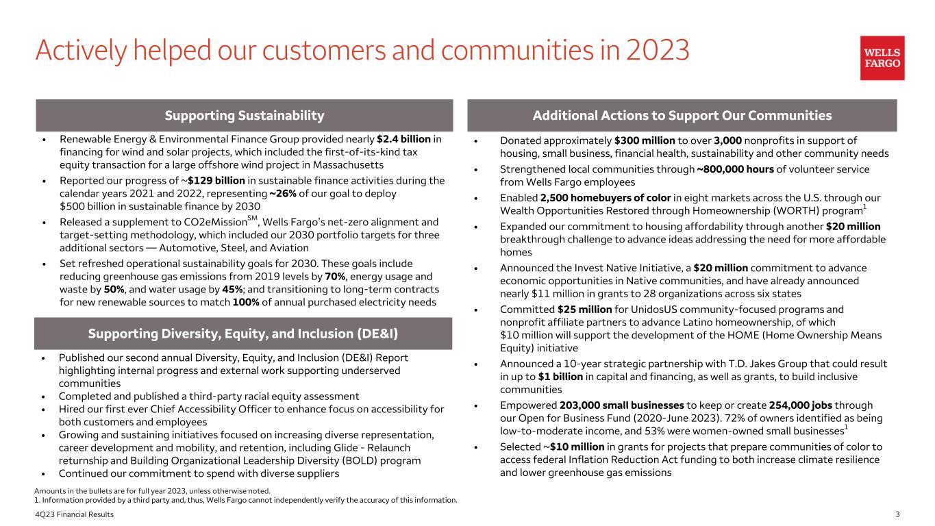 34Q23 Financial Results • Renewable Energy & Environmental Finance Group provided nearly $2.4 billion in financing for wind and solar projects, which included the first‑of‑its‑kind tax equity transaction for a large offshore wind project in Massachusetts • Reported our progress of ~$129 billion in sustainable finance activities during the calendar years 2021 and 2022, representing ~26% of our goal to deploy $500 billion in sustainable finance by 2030 • Released a supplement to CO2eMissionSM, Wells Fargo’s net-zero alignment and target-setting methodology, which included our 2030 portfolio targets for three additional sectors — Automotive, Steel, and Aviation • Set refreshed operational sustainability goals for 2030. These goals include reducing greenhouse gas emissions from 2019 levels by 70%, energy usage and waste by 50%, and water usage by 45%; and transitioning to long-term contracts for new renewable sources to match 100% of annual purchased electricity needs Actively helped our customers and communities in 2023 Amounts in the bullets are for full year 2023, unless otherwise noted. 1. Information provided by a third party and, thus, Wells Fargo cannot independently verify the accuracy of this information. Supporting Sustainability Supporting Diversity, Equity, and Inclusion (DE&I) • Published our second annual Diversity, Equity, and Inclusion (DE&I) Report highlighting internal progress and external work supporting underserved communities • Completed and published a third-party racial equity assessment • Hired our first ever Chief Accessibility Officer to enhance focus on accessibility for both customers and employees • Growing and sustaining initiatives focused on increasing diverse representation, career development and mobility, and retention, including Glide - Relaunch returnship and Building Organizational Leadership Diversity (BOLD) program • Continued our commitment to spend with diverse suppliers Additional Actions to Support Our Communities • Donated approximately $300 million to over 3,000 nonprofits in support of housing, small business, financial health, sustainability and other community needs • Strengthened local communities through ~800,000 hours of volunteer service from Wells Fargo employees • Enabled 2,500 homebuyers of color in eight markets across the U.S. through our Wealth Opportunities Restored through Homeownership (WORTH) program1 • Expanded our commitment to housing affordability through another $20 million breakthrough challenge to advance ideas addressing the need for more affordable homes • Announced the Invest Native Initiative, a $20 million commitment to advance economic opportunities in Native communities, and have already announced nearly $11 million in grants to 28 organizations across six states • Committed $25 million for UnidosUS community-focused programs and nonprofit affiliate partners to advance Latino homeownership, of which $10 million will support the development of the HOME (Home Ownership Means Equity) initiative • Announced a 10-year strategic partnership with T.D. Jakes Group that could result in up to $1 billion in capital and financing, as well as grants, to build inclusive communities • Empowered 203,000 small businesses to keep or create 254,000 jobs through our Open for Business Fund (2020-June 2023). 72% of owners identified as being low-to-moderate income, and 53% were women-owned small businesses1 • Selected ~$10 million in grants for projects that prepare communities of color to access federal Inflation Reduction Act funding to both increase climate resilience and lower greenhouse gas emissions