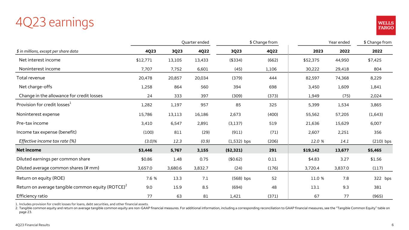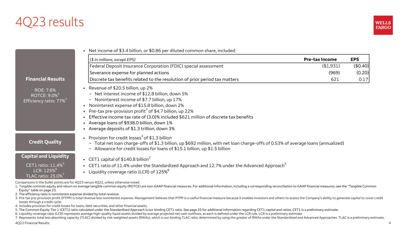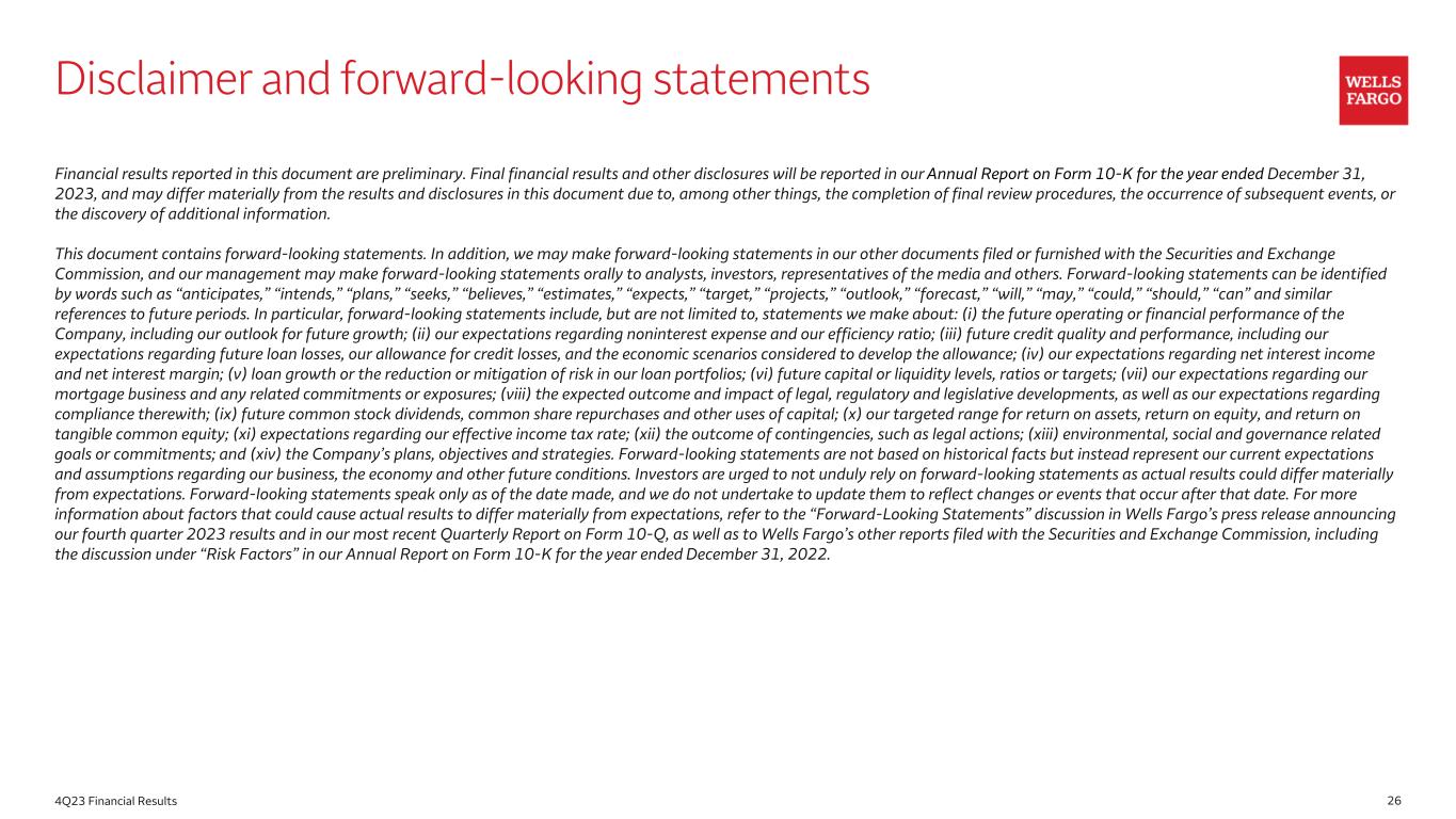 264Q23 Financial Results Disclaimer and forward-looking statements Financial results reported in this document are preliminary. Final financial results and other disclosures will be reported in our Annual Report on Form 10-K for the year ended December 31, 2023, and may differ materially from the results and disclosures in this document due to, among other things, the completion of final review procedures, the occurrence of subsequent events, or the discovery of additional information. This document contains forward-looking statements. In addition, we may make forward-looking statements in our other documents filed or furnished with the Securities and Exchange Commission, and our management may make forward-looking statements orally to analysts, investors, representatives of the media and others. Forward-looking statements can be identified by words such as “anticipates,” “intends,” “plans,” “seeks,” “believes,” “estimates,” “expects,” “target,” “projects,” “outlook,” “forecast,” “will,” “may,” “could,” “should,” “can” and similar references to future periods. In particular, forward-looking statements include, but are not limited to, statements we make about: (i) the future operating or financial performance of the Company, including our outlook for future growth; (ii) our expectations regarding noninterest expense and our efficiency ratio; (iii) future credit quality and performance, including our expectations regarding future loan losses, our allowance for credit losses, and the economic scenarios considered to develop the allowance; (iv) our expectations regarding net interest income and net interest margin; (v) loan growth or the reduction or mitigation of risk in our loan portfolios; (vi) future capital or liquidity levels, ratios or targets; (vii) our expectations regarding our mortgage business and any related commitments or exposures; (viii) the expected outcome and impact of legal, regulatory and legislative developments, as well as our expectations regarding compliance therewith; (ix) future common stock dividends, common share repurchases and other uses of capital; (x) our targeted range for return on assets, return on equity, and return on tangible common equity; (xi) expectations regarding our effective income tax rate; (xii) the outcome of contingencies, such as legal actions; (xiii) environmental, social and governance related goals or commitments; and (xiv) the Company’s plans, objectives and strategies. Forward-looking statements are not based on historical facts but instead represent our current expectations and assumptions regarding our business, the economy and other future conditions. Investors are urged to not unduly rely on forward-looking statements as actual results could differ materially from expectations. Forward-looking statements speak only as of the date made, and we do not undertake to update them to reflect changes or events that occur after that date. For more information about factors that could cause actual results to differ materially from expectations, refer to the “Forward-Looking Statements” discussion in Wells Fargo’s press release announcing our fourth quarter 2023 results and in our most recent Quarterly Report on Form 10-Q, as well as to Wells Fargo’s other reports filed with the Securities and Exchange Commission, including the discussion under “Risk Factors” in our Annual Report on Form 10-K for the year ended December 31, 2022.