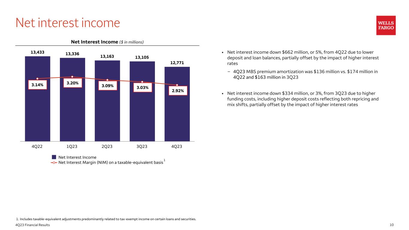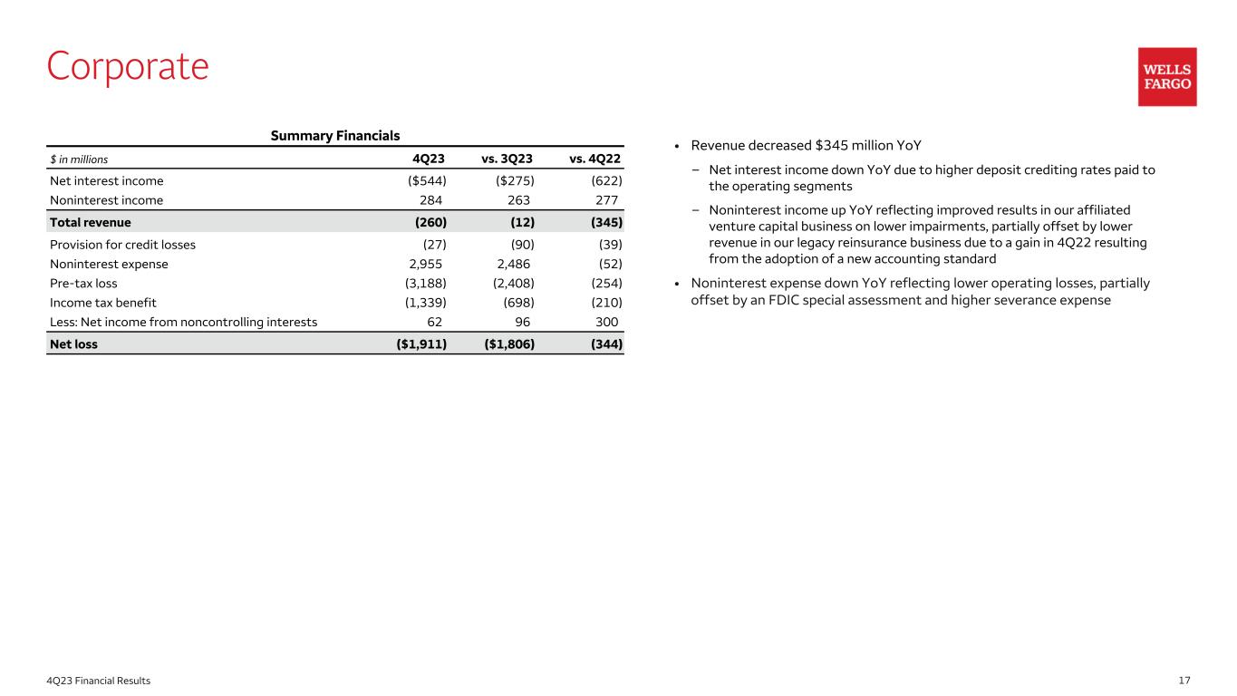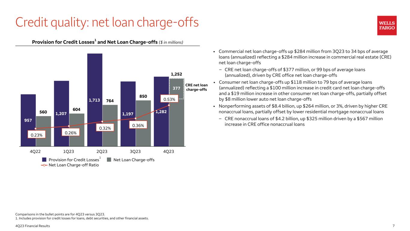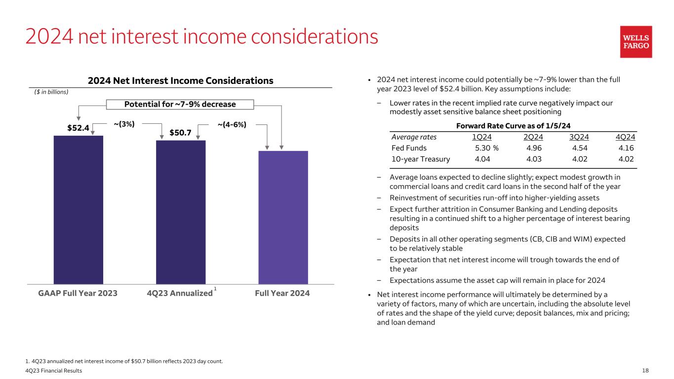 264Q23 Financial Results Disclaimer and forward-looking statements Financial results reported in this document are preliminary. Final financial results and other disclosures will be reported in our Annual Report on Form 10-K for the year ended December 31, 2023, and may differ materially from the results and disclosures in this document due to, among other things, the completion of final review procedures, the occurrence of subsequent events, or the discovery of additional information. This document contains forward-looking statements. In addition, we may make forward-looking statements in our other documents filed or furnished with the Securities and Exchange Commission, and our management may make forward-looking statements orally to analysts, investors, representatives of the media and others. Forward-looking statements can be identified by words such as “anticipates,” “intends,” “plans,” “seeks,” “believes,” “estimates,” “expects,” “target,” “projects,” “outlook,” “forecast,” “will,” “may,” “could,” “should,” “can” and similar references to future periods. In particular, forward-looking statements include, but are not limited to, statements we make about: (i) the future operating or financial performance of the Company, including our outlook for future growth; (ii) our expectations regarding noninterest expense and our efficiency ratio; (iii) future credit quality and performance, including our expectations regarding future loan losses, our allowance for credit losses, and the economic scenarios considered to develop the allowance; (iv) our expectations regarding net interest income and net interest margin; (v) loan growth or the reduction or mitigation of risk in our loan portfolios; (vi) future capital or liquidity levels, ratios or targets; (vii) our expectations regarding our mortgage business and any related commitments or exposures; (viii) the expected outcome and impact of legal, regulatory and legislative developments, as well as our expectations regarding compliance therewith; (ix) future common stock dividends, common share repurchases and other uses of capital; (x) our targeted range for return on assets, return on equity, and return on tangible common equity; (xi) expectations regarding our effective income tax rate; (xii) the outcome of contingencies, such as legal actions; (xiii) environmental, social and governance related goals or commitments; and (xiv) the Company’s plans, objectives and strategies. Forward-looking statements are not based on historical facts but instead represent our current expectations and assumptions regarding our business, the economy and other future conditions. Investors are urged to not unduly rely on forward-looking statements as actual results could differ materially from expectations. Forward-looking statements speak only as of the date made, and we do not undertake to update them to reflect changes or events that occur after that date. For more information about factors that could cause actual results to differ materially from expectations, refer to the “Forward-Looking Statements” discussion in Wells Fargo’s press release announcing our fourth quarter 2023 results and in our most recent Quarterly Report on Form 10-Q, as well as to Wells Fargo’s other reports filed with the Securities and Exchange Commission, including the discussion under “Risk Factors” in our Annual Report on Form 10-K for the year ended December 31, 2022.