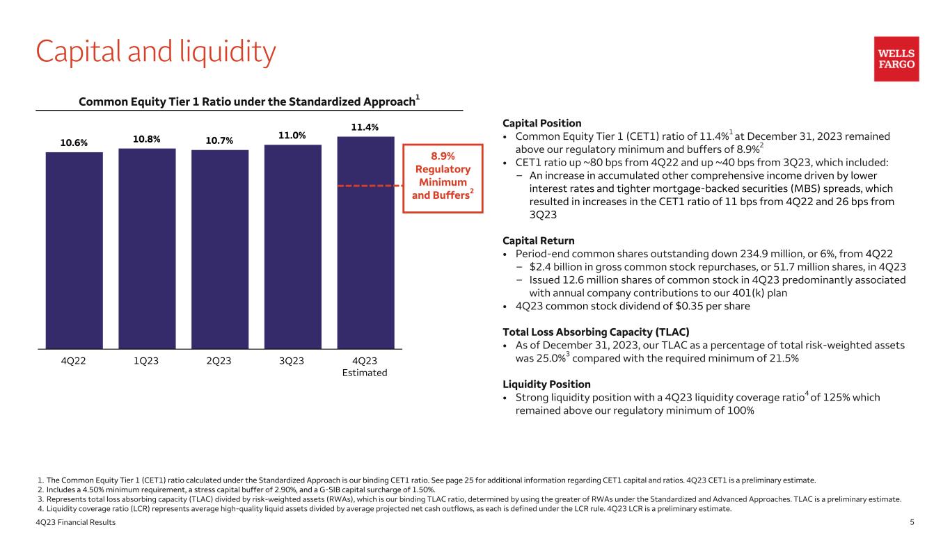 54Q23 Financial Results Capital and liquidity Capital Position • Common Equity Tier 1 (CET1) ratio of 11.4%1 at December 31, 2023 remained above our regulatory minimum and buffers of 8.9%2 • CET1 ratio up ~80 bps from 4Q22 and up ~40 bps from 3Q23, which included: – An increase in accumulated other comprehensive income driven by lower interest rates and tighter mortgage-backed securities (MBS) spreads, which resulted in increases in the CET1 ratio of 11 bps from 4Q22 and 26 bps from 3Q23 Capital Return • Period-end common shares outstanding down 234.9 million, or 6%, from 4Q22 – $2.4 billion in gross common stock repurchases, or 51.7 million shares, in 4Q23 – Issued 12.6 million shares of common stock in 4Q23 predominantly associated with annual company contributions to our 401(k) plan • 4Q23 common stock dividend of $0.35 per share Total Loss Absorbing Capacity (TLAC) • As of December 31, 2023, our TLAC as a percentage of total risk-weighted assets was 25.0%3 compared with the required minimum of 21.5% Liquidity Position • Strong liquidity position with a 4Q23 liquidity coverage ratio4 of 125% which remained above our regulatory minimum of 100% 10.6% 10.8% 10.7% 11.0% 11.4% 4Q22 1Q23 2Q23 3Q23 4Q23 Estimated 1. The Common Equity Tier 1 (CET1) ratio calculated under the Standardized Approach is our binding CET1 ratio. See page 25 for additional information regarding CET1 capital and ratios. 4Q23 CET1 is a preliminary estimate. 2. Includes a 4.50% minimum requirement, a stress capital buffer of 2.90%, and a G-SIB capital surcharge of 1.50%. 3. Represents total loss absorbing capacity (TLAC) divided by risk-weighted assets (RWAs), which is our binding TLAC ratio, determined by using the greater of RWAs under the Standardized and Advanced Approaches. TLAC is a preliminary estimate. 4. Liquidity coverage ratio (LCR) represents average high-quality liquid assets divided by average projected net cash outflows, as each is defined under the LCR rule. 4Q23 LCR is a preliminary estimate. 8.9% Regulatory Minimum and Buffers2 Common Equity Tier 1 Ratio under the Standardized Approach1
