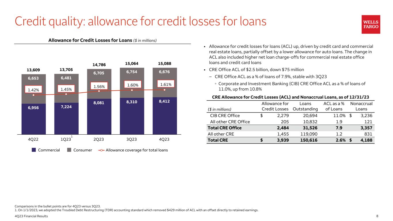 74Q23 Financial Results 957 1,207 1,713 1,197 1,282560 604 764 850 1,252 Provision for Credit Losses Net Loan Charge-offs Net Loan Charge-off Ratio 4Q22 1Q23 2Q23 3Q23 4Q23 Credit quality: net loan charge-offs • Commercial net loan charge-offs up $284 million from 3Q23 to 34 bps of average loans (annualized) reflecting a $284 million increase in commercial real estate (CRE) net loan charge-offs – CRE net loan charge-offs of $377 million, or 99 bps of average loans (annualized), driven by CRE office net loan charge-offs • Consumer net loan charge-offs up $118 million to 79 bps of average loans (annualized) reflecting a $100 million increase in credit card net loan charge-offs and a $19 million increase in other consumer net loan charge-offs, partially offset by $8 million lower auto net loan charge-offs • Nonperforming assets of $8.4 billion, up $264 million, or 3%, driven by higher CRE nonaccrual loans, partially offset by lower residential mortgage nonaccrual loans – CRE nonaccrual loans of $4.2 billion, up $325 million driven by a $567 million increase in CRE office nonaccrual loans Provision for Credit Losses1 and Net Loan Charge-offs ($ in millions) Comparisons in the bullet points are for 4Q23 versus 3Q23. 1. Includes provision for credit losses for loans, debt securities, and other financial assets. 0.23% 0.26% 0.36% 0.32% 1 377 CRE net loan charge-offs 0.53%