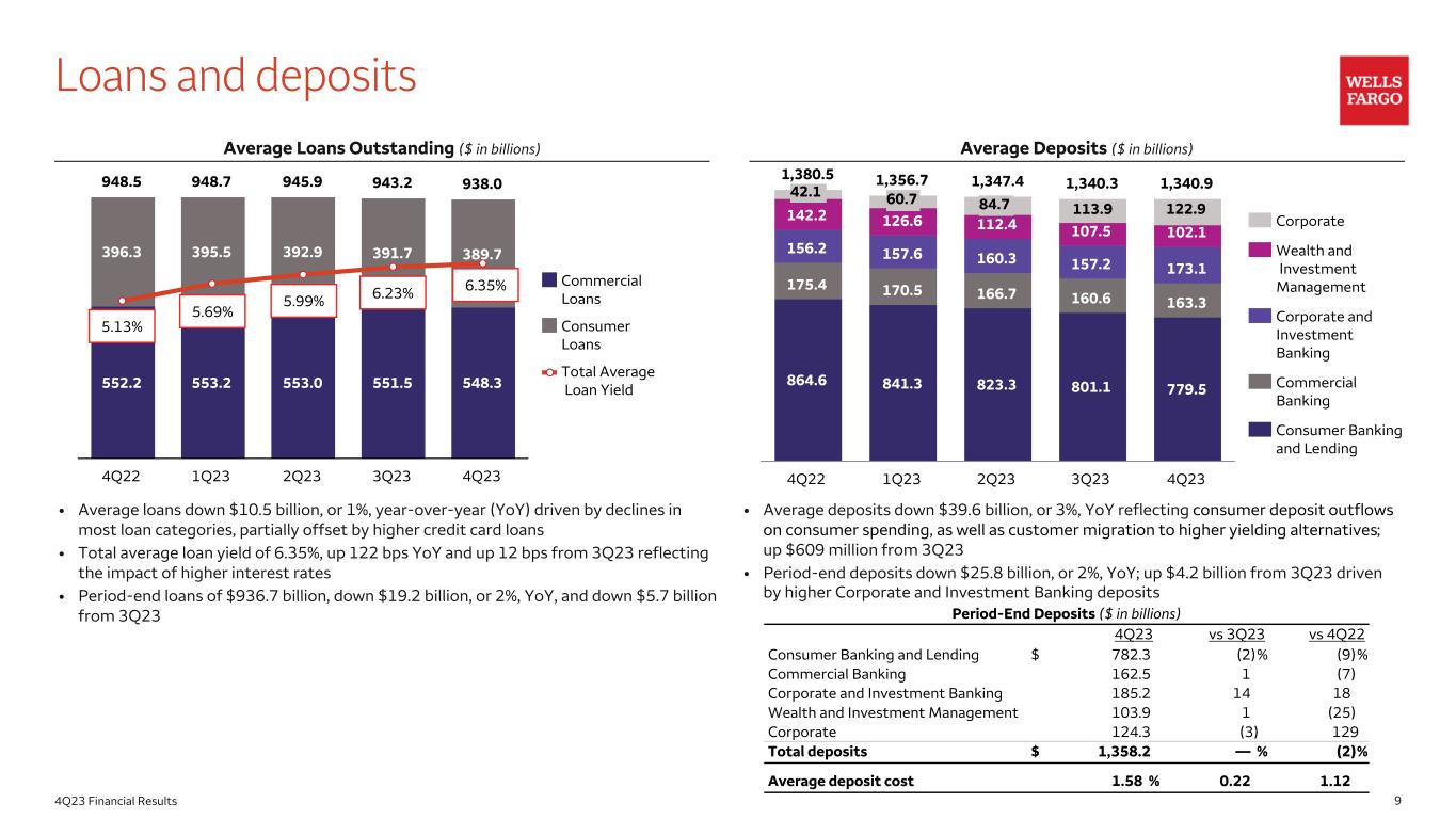 94Q23 Financial Results Loans and deposits • Average loans down $10.5 billion, or 1%, year-over-year (YoY) driven by declines in most loan categories, partially offset by higher credit card loans • Total average loan yield of 6.35%, up 122 bps YoY and up 12 bps from 3Q23 reflecting the impact of higher interest rates • Period-end loans of $936.7 billion, down $19.2 billion, or 2%, YoY, and down $5.7 billion from 3Q23 • Average deposits down $39.6 billion, or 3%, YoY reflecting consumer deposit outflows on consumer spending, as well as customer migration to higher yielding alternatives; up $609 million from 3Q23 • Period-end deposits down $25.8 billion, or 2%, YoY; up $4.2 billion from 3Q23 driven by higher Corporate and Investment Banking deposits Average Loans Outstanding ($ in billions) Average Deposits ($ in billions) 948.5 948.7 945.9 943.2 938.0 552.2 553.2 553.0 551.5 548.3 396.3 395.5 392.9 391.7 389.7 Commercial Loans Consumer Loans Total Average Loan Yield 4Q22 1Q23 2Q23 3Q23 4Q23 5.13% 5.69% 5.99% 6.23% 6.35% Period-End Deposits ($ in billions) 4Q23 vs 3Q23 vs 4Q22 Consumer Banking and Lending $ 782.3 (2) % (9) % Commercial Banking 162.5 1 (7) Corporate and Investment Banking 185.2 14 18 Wealth and Investment Management 103.9 1 (25) Corporate 124.3 (3) 129 Total deposits $ 1,358.2 — % (2) % Average deposit cost 1.58 % 0.22 1.12 1,380.5 1,356.7 1,347.4 1,340.3 1,340.9 864.6 841.3 823.3 801.1 779.5 175.4 170.5 166.7 160.6 163.3 156.2 157.6 160.3 157.2 173.1 142.2 126.6 112.4 107.5 102.1 Corporate Wealth and Investment Management Corporate and Investment Banking Commercial Banking Consumer Banking and Lending 4Q22 1Q23 2Q23 3Q23 4Q23 42.1 60.7 84.7 113.9 122.9