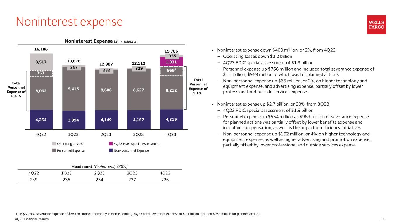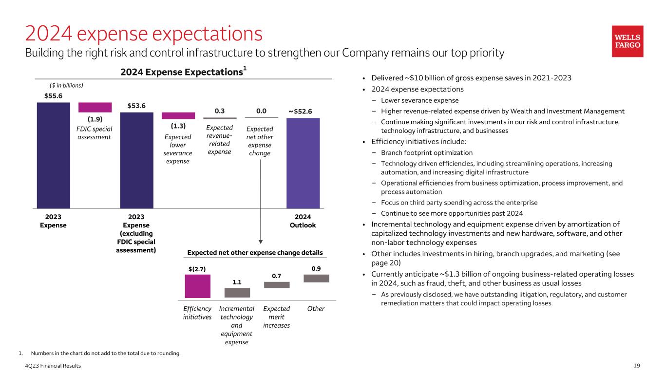 194Q23 Financial Results 1.1 0.7 0.9 Efficiency initiatives Incremental technology and equipment expense Expected merit increases Other $55.6 (1.9) $53.6 (1.3) 0.3 0.0 $52.6 2023 Expense 2023 Expense (excluding FDIC special assessment) 2024 Outlook 2024 Expense Expectations1 2024 expense expectations Building the right risk and control infrastructure to strengthen our Company remains our top priority • Delivered ~$10 billion of gross expense saves in 2021-2023 • 2024 expense expectations – Lower severance expense – Higher revenue-related expense driven by Wealth and Investment Management – Continue making significant investments in our risk and control infrastructure, technology infrastructure, and businesses • Efficiency initiatives include: – Branch footprint optimization – Technology driven efficiencies, including streamlining operations, increasing automation, and increasing digital infrastructure – Operational efficiencies from business optimization, process improvement, and process automation – Focus on third party spending across the enterprise – Continue to see more opportunities past 2024 • Incremental technology and equipment expense driven by amortization of capitalized technology investments and new hardware, software, and other non-labor technology expenses • Other includes investments in hiring, branch upgrades, and marketing (see page 20) • Currently anticipate ~$1.3 billion of ongoing business-related operating losses in 2024, such as fraud, theft, and other business as usual losses – As previously disclosed, we have outstanding litigation, regulatory, and customer remediation matters that could impact operating losses ($ in billions) Expected net other expense change details Expected net other expense change Expected revenue- related expense $(2.7) FDIC special assessment Expected lower severance expense ~ 1. Numbers in the chart do not add to the total due to rounding.
