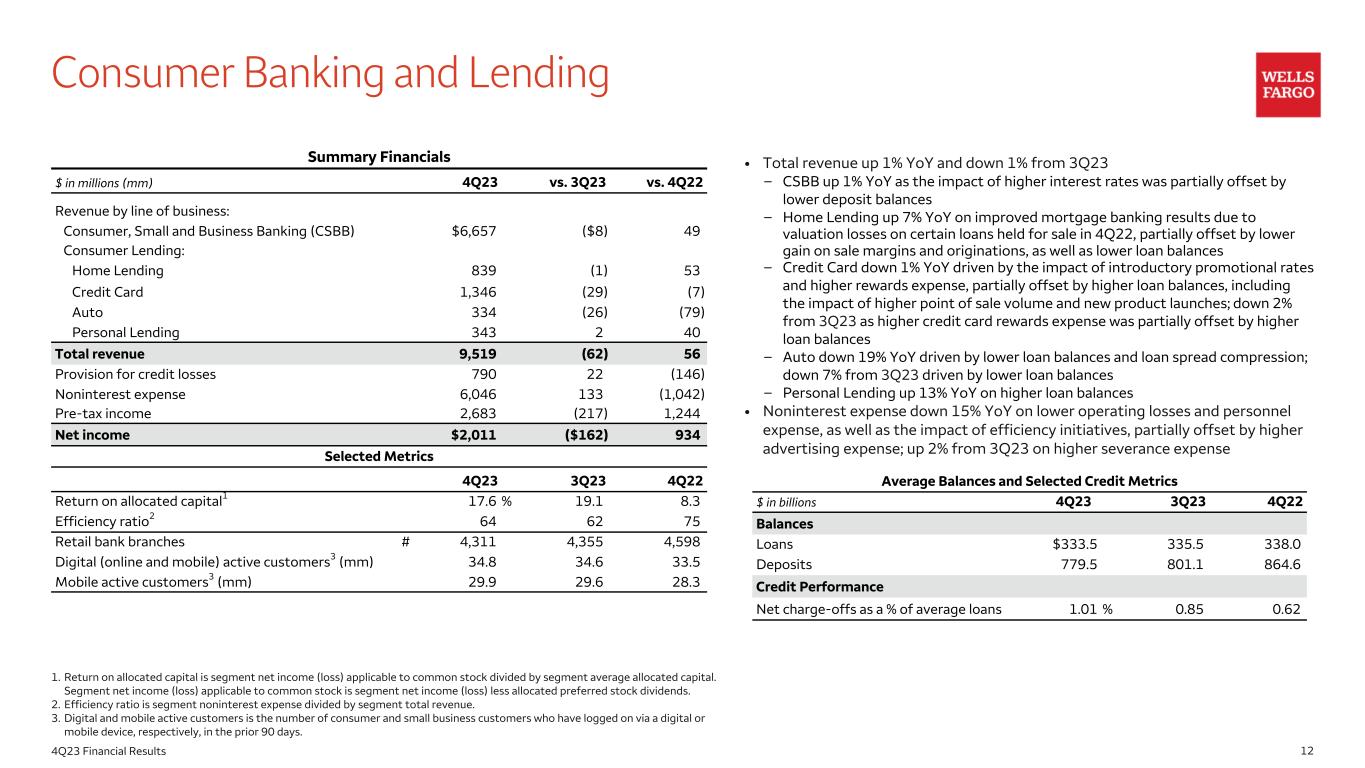 124Q23 Financial Results • Total revenue up 1% YoY and down 1% from 3Q23 – CSBB up 1% YoY as the impact of higher interest rates was partially offset by lower deposit balances – Home Lending up 7% YoY on improved mortgage banking results due to valuation losses on certain loans held for sale in 4Q22, partially offset by lower gain on sale margins and originations, as well as lower loan balances – Credit Card down 1% YoY driven by the impact of introductory promotional rates and higher rewards expense, partially offset by higher loan balances, including the impact of higher point of sale volume and new product launches; down 2% from 3Q23 as higher credit card rewards expense was partially offset by higher loan balances – Auto down 19% YoY driven by lower loan balances and loan spread compression; down 7% from 3Q23 driven by lower loan balances – Personal Lending up 13% YoY on higher loan balances • Noninterest expense down 15% YoY on lower operating losses and personnel expense, as well as the impact of efficiency initiatives, partially offset by higher advertising expense; up 2% from 3Q23 on higher severance expense Consumer Banking and Lending 1. Return on allocated capital is segment net income (loss) applicable to common stock divided by segment average allocated capital. Segment net income (loss) applicable to common stock is segment net income (loss) less allocated preferred stock dividends. 2. Efficiency ratio is segment noninterest expense divided by segment total revenue. 3. Digital and mobile active customers is the number of consumer and small business customers who have logged on via a digital or mobile device, respectively, in the prior 90 days. Summary Financials $ in millions (mm) 4Q23 vs. 3Q23 vs. 4Q22 Revenue by line of business: Consumer, Small and Business Banking (CSBB) $6,657 ($8) 49 Consumer Lending: Home Lending 839 (1) 53 Credit Card 1,346 (29) (7) Auto 334 (26) (79) Personal Lending 343 2 40 Total revenue 9,519 (62) 56 Provision for credit losses 790 22 (146) Noninterest expense 6,046 133 (1,042) Pre-tax income 2,683 (217) 1,244 Net income $2,011 ($162) 934 Selected Metrics 4Q23 3Q23 4Q22 Return on allocated capital1 17.6 % 19.1 8.3 Efficiency ratio2 64 62 75 Retail bank branches # 4,311 4,355 4,598 Digital (online and mobile) active customers3 (mm) 34.8 34.6 33.5 Mobile active customers3 (mm) 29.9 29.6 28.3 Average Balances and Selected Credit Metrics $ in billions 4Q23 3Q23 4Q22 Balances Loans $333.5 335.5 338.0 Deposits 779.5 801.1 864.6 Credit Performance Net charge-offs as a % of average loans 1.01 % 0.85 0.62
