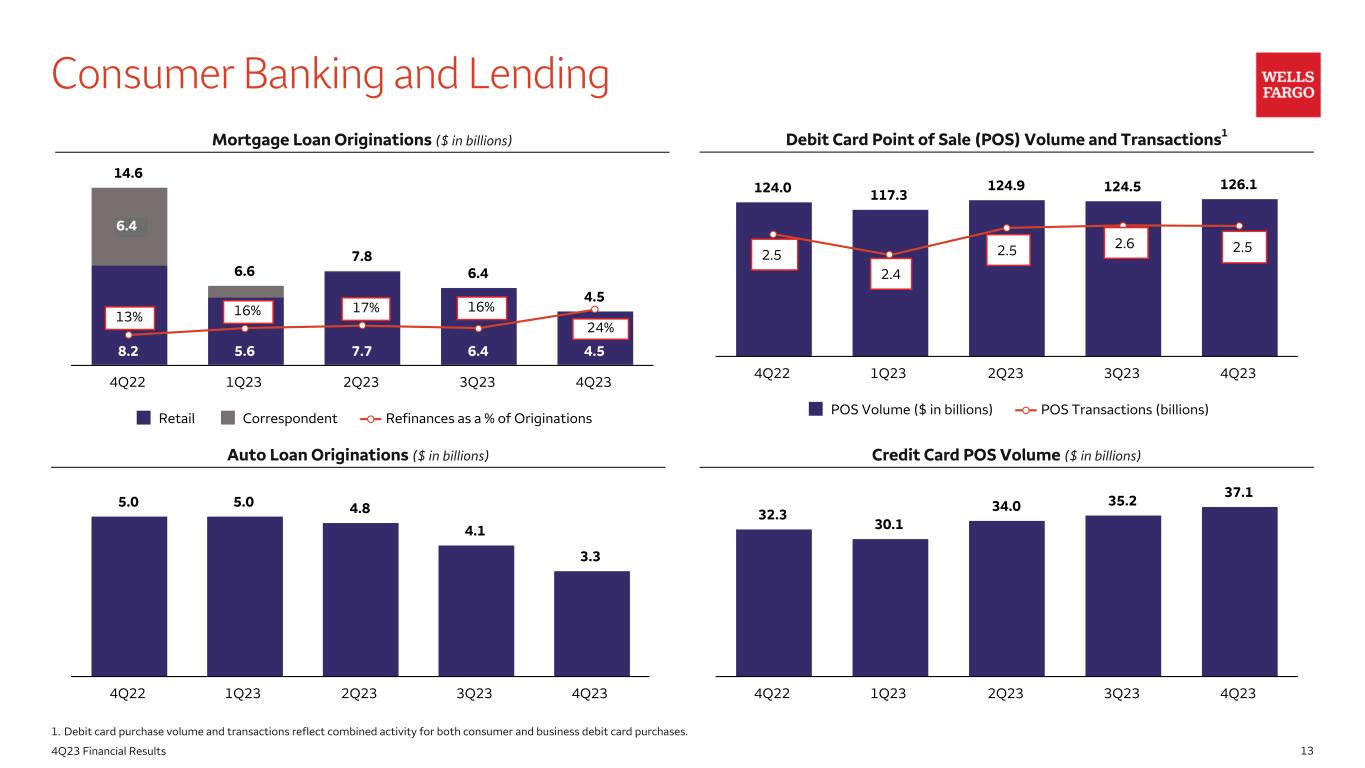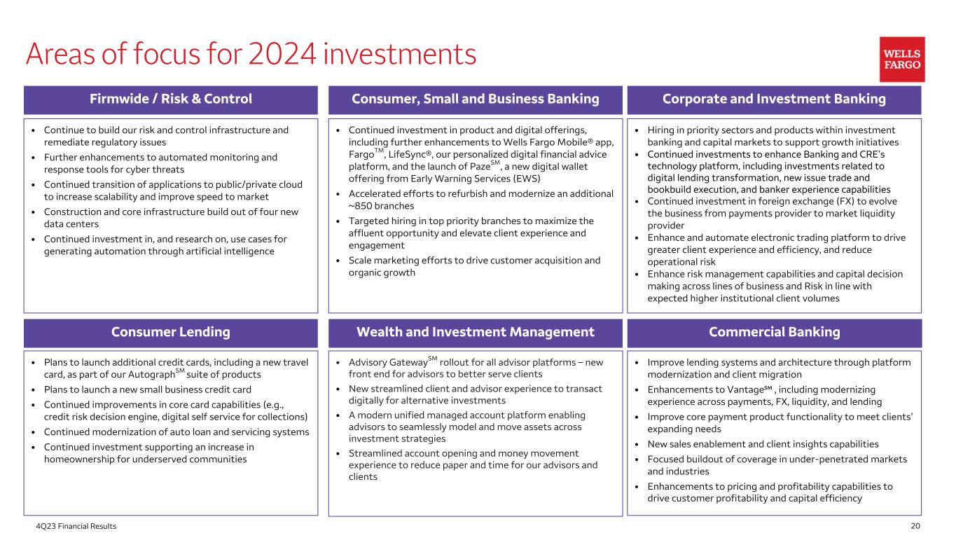 204Q23 Financial Results Areas of focus for 2024 investments Consumer Lending • Plans to launch additional credit cards, including a new travel card, as part of our AutographSM suite of products • Plans to launch a new small business credit card • Continued improvements in core card capabilities (e.g., credit risk decision engine, digital self service for collections) • Continued modernization of auto loan and servicing systems • Continued investment supporting an increase in homeownership for underserved communities Corporate and Investment Banking • Hiring in priority sectors and products within investment banking and capital markets to support growth initiatives • Continued investments to enhance Banking and CRE’s technology platform, including investments related to digital lending transformation, new issue trade and bookbuild execution, and banker experience capabilities • Continued investment in foreign exchange (FX) to evolve the business from payments provider to market liquidity provider • Enhance and automate electronic trading platform to drive greater client experience and efficiency, and reduce operational risk • Enhance risk management capabilities and capital decision making across lines of business and Risk in line with expected higher institutional client volumes Commercial Banking • Improve lending systems and architecture through platform modernization and client migration • Enhancements to Vantage℠ , including modernizing experience across payments, FX, liquidity, and lending • Improve core payment product functionality to meet clients’ expanding needs • New sales enablement and client insights capabilities • Focused buildout of coverage in under-penetrated markets and industries • Enhancements to pricing and profitability capabilities to drive customer profitability and capital efficiency Wealth and Investment Management • Advisory GatewaySM rollout for all advisor platforms – new front end for advisors to better serve clients • New streamlined client and advisor experience to transact digitally for alternative investments • A modern unified managed account platform enabling advisors to seamlessly model and move assets across investment strategies • Streamlined account opening and money movement experience to reduce paper and time for our advisors and clients Firmwide / Risk & Control • Continue to build our risk and control infrastructure and remediate regulatory issues • Further enhancements to automated monitoring and response tools for cyber threats • Continued transition of applications to public/private cloud to increase scalability and improve speed to market • Construction and core infrastructure build out of four new data centers • Continued investment in, and research on, use cases for generating automation through artificial intelligence Consumer, Small and Business Banking • Continued investment in product and digital offerings, including further enhancements to Wells Fargo Mobile® app, FargoTM, LifeSync®, our personalized digital financial advice platform, and the launch of PazeSM, a new digital wallet offering from Early Warning Services (EWS) • Accelerated efforts to refurbish and modernize an additional ~850 branches • Targeted hiring in top priority branches to maximize the affluent opportunity and elevate client experience and engagement • Scale marketing efforts to drive customer acquisition and organic growth