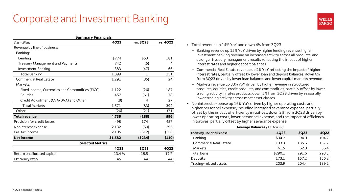 154Q23 Financial Results Corporate and Investment Banking • Total revenue up 14% YoY and down 4% from 3Q23 – Banking revenue up 15% YoY driven by higher lending revenue, higher investment banking revenue on increased activity across all products, and stronger treasury management results reflecting the impact of higher interest rates and higher deposit balances – Commercial Real Estate revenue up 2% YoY reflecting the impact of higher interest rates, partially offset by lower loan and deposit balances; down 6% from 3Q23 driven by lower loan balances and lower capital markets revenue – Markets revenue up 33% YoY driven by higher revenue in structured products, equities, credit products, and commodities, partially offset by lower trading activity in rates products; down 5% from 3Q23 driven by seasonally lower trading activity across most asset classes • Noninterest expense up 16% YoY driven by higher operating costs and higher personnel expense, including increased severance expense, partially offset by the impact of efficiency initiatives; down 2% from 3Q23 driven by lower operating costs, lower personnel expense, and the impact of efficiency initiatives, partially offset by higher severance expense Summary Financials $ in millions 4Q23 vs. 3Q23 vs. 4Q22 Revenue by line of business: Banking: Lending $774 $53 181 Treasury Management and Payments 742 (5) 4 Investment Banking 383 (47) 66 Total Banking 1,899 1 251 Commercial Real Estate 1,291 (85) 24 Markets: Fixed Income, Currencies and Commodities (FICC) 1,122 (26) 187 Equities 457 (61) 178 Credit Adjustment (CVA/DVA) and Other (8) 4 27 Total Markets 1,571 (83) 392 Other (26) (21) (71) Total revenue 4,735 (188) 596 Provision for credit losses 498 174 457 Noninterest expense 2,132 (50) 295 Pre-tax income 2,105 (312) (156) Net income $1,582 ($234) (110) Selected Metrics 4Q23 3Q23 4Q22 Return on allocated capital 13.4 % 15.5 17.7 Efficiency ratio 45 44 44 Average Balances ($ in billions) Loans by line of business 4Q23 3Q23 4Q22 Banking $94.7 94.0 104.2 Commercial Real Estate 133.9 135.6 137.7 Markets 61.5 62.0 56.4 Total loans $290.1 291.6 298.3 Deposits 173.1 157.2 156.2 Trading-related assets 203.9 204.4 189.2