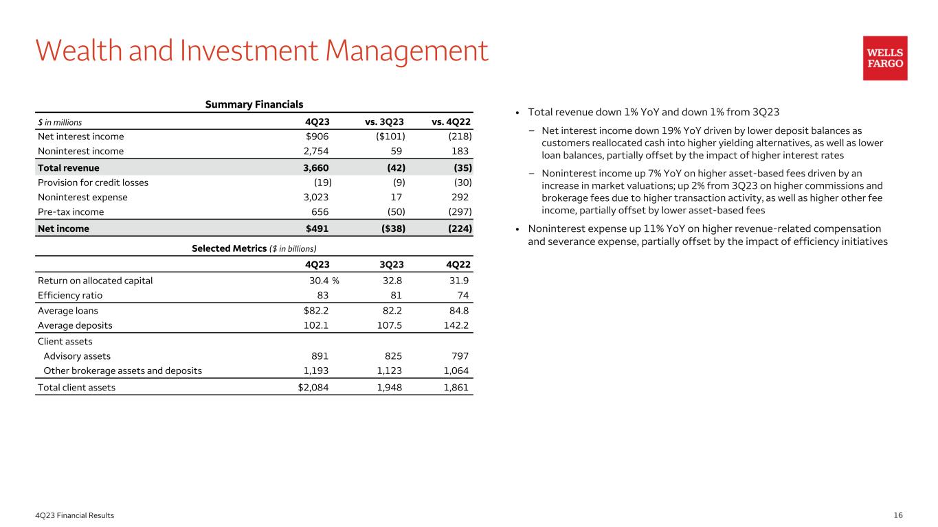 164Q23 Financial Results Wealth and Investment Management Summary Financials $ in millions 4Q23 vs. 3Q23 vs. 4Q22 Net interest income $906 ($101) (218) Noninterest income 2,754 59 183 Total revenue 3,660 (42) (35) Provision for credit losses (19) (9) (30) Noninterest expense 3,023 17 292 Pre-tax income 656 (50) (297) Net income $491 ($38) (224) Selected Metrics ($ in billions) 4Q23 3Q23 4Q22 Return on allocated capital 30.4 % 32.8 31.9 Efficiency ratio 83 81 74 Average loans $82.2 82.2 84.8 Average deposits 102.1 107.5 142.2 Client assets Advisory assets 891 825 797 Other brokerage assets and deposits 1,193 1,123 1,064 Total client assets $2,084 1,948 1,861 • Total revenue down 1% YoY and down 1% from 3Q23 – Net interest income down 19% YoY driven by lower deposit balances as customers reallocated cash into higher yielding alternatives, as well as lower loan balances, partially offset by the impact of higher interest rates – Noninterest income up 7% YoY on higher asset-based fees driven by an increase in market valuations; up 2% from 3Q23 on higher commissions and brokerage fees due to higher transaction activity, as well as higher other fee income, partially offset by lower asset-based fees • Noninterest expense up 11% YoY on higher revenue-related compensation and severance expense, partially offset by the impact of efficiency initiatives