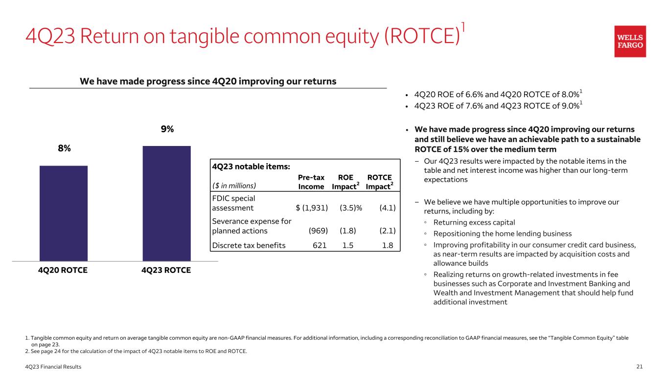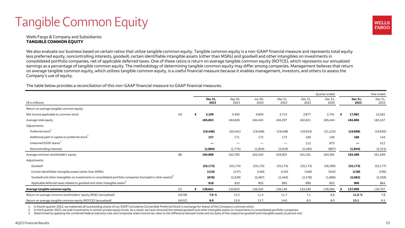 234Q23 Financial Results Tangible Common Equity Wells Fargo & Company and Subsidiaries TANGIBLE COMMON EQUITY We also evaluate our business based on certain ratios that utilize tangible common equity. Tangible common equity is a non-GAAP financial measure and represents total equity less preferred equity, noncontrolling interests, goodwill, certain identifiable intangible assets (other than MSRs) and goodwill and other intangibles on investments in consolidated portfolio companies, net of applicable deferred taxes. One of these ratios is return on average tangible common equity (ROTCE), which represents our annualized earnings as a percentage of tangible common equity. The methodology of determining tangible common equity may differ among companies. Management believes that return on average tangible common equity, which utilizes tangible common equity, is a useful financial measure because it enables management, investors, and others to assess the Company’s use of equity. The table below provides a reconciliation of this non-GAAP financial measure to GAAP financial measures. Quarter ended Year ended ($ in millions) Dec 31, 2023 Sep 30, 2023 Jun 30, 2023 Mar 31, 2023 Dec 31, 2022 Dec 31, 2020 Dec 31, 2023 Dec 31, 2022 Return on average tangible common equity: Net income applicable to common stock (A) $ 3,160 5,450 4,659 4,713 2,877 2,741 $ 17,982 12,562 Average total equity 185,853 184,828 184,443 184,297 182,621 185,444 184,860 183,167 Adjustments: Preferred stock1 (19,448) (20,441) (19,448) (19,448) (19,553) (21,223) (19,698) (19,930) Additional paid-in capital on preferred stock1 157 171 173 173 166 156 168 143 Unearned ESOP shares1 — — — — 112 875 — 512 Noncontrolling interests (1,664) (1,775) (1,924) (2,019) (2,185) (887) (1,844) (2,323) Average common stockholders’ equity (B) 164,898 162,783 163,244 163,003 161,161 164,365 163,486 161,569 Adjustments: Goodwill (25,173) (25,174) (25,175) (25,173) (25,173) (26,390) (25,173) (25,177) Certain identifiable intangible assets (other than MSRs) (124) (137) (140) (145) (160) (354) (136) (190) Goodwill and other intangibles on investments in consolidated portfolio companies (included in other assets)2 (878) (2,539) (2,487) (2,440) (2,378) (1,889) (2,083) (2,359) Applicable deferred taxes related to goodwill and other intangible assets3 918 910 903 895 890 852 906 864 Average tangible common equity (C) $ 139,641 135,843 136,345 136,140 134,340 136,584 $ 137,000 134,707 Return on average common stockholders’ equity (ROE) (annualized) (A)/(B) 7.6 % 13.3 11.4 11.7 7.1 6.6 11.0 % 7.8 Return on average tangible common equity (ROTCE) (annualized) (A)/(C) 9.0 15.9 13.7 14.0 8.5 8.0 13.1 9.3 1. In fourth quarter 2022, we redeemed all outstanding shares of our ESOP Cumulative Convertible Preferred Stock in exchange for shares of the Company’s common stock. 2. In third quarter 2023, we sold investments in certain private equity funds. As a result, we have removed the related goodwill and other intangible assets on investments in consolidated portfolio companies. 3. Determined by applying the combined federal statutory rate and composite state income tax rates to the difference between book and tax basis of the respective goodwill and intangible assets at period-end.
